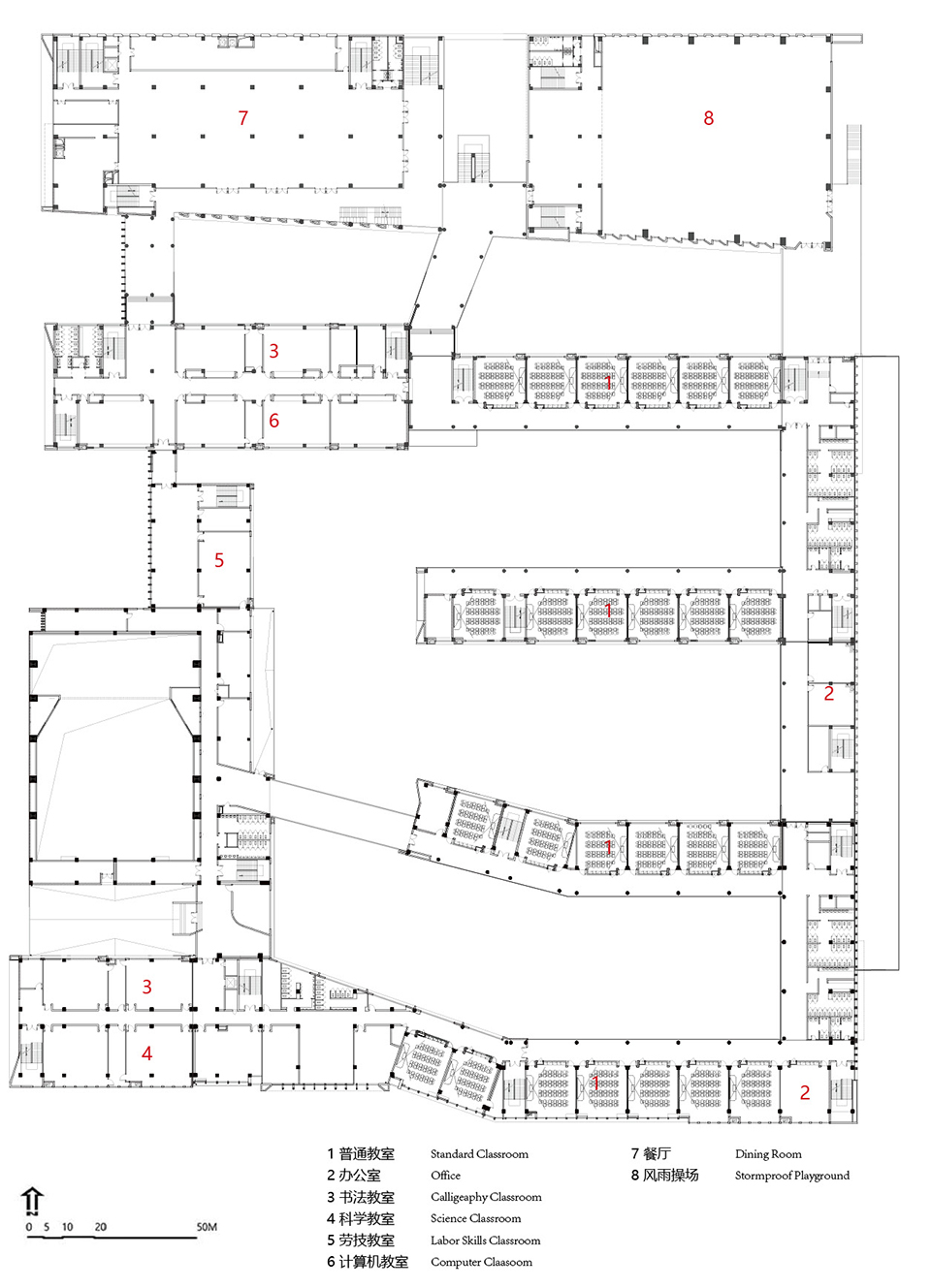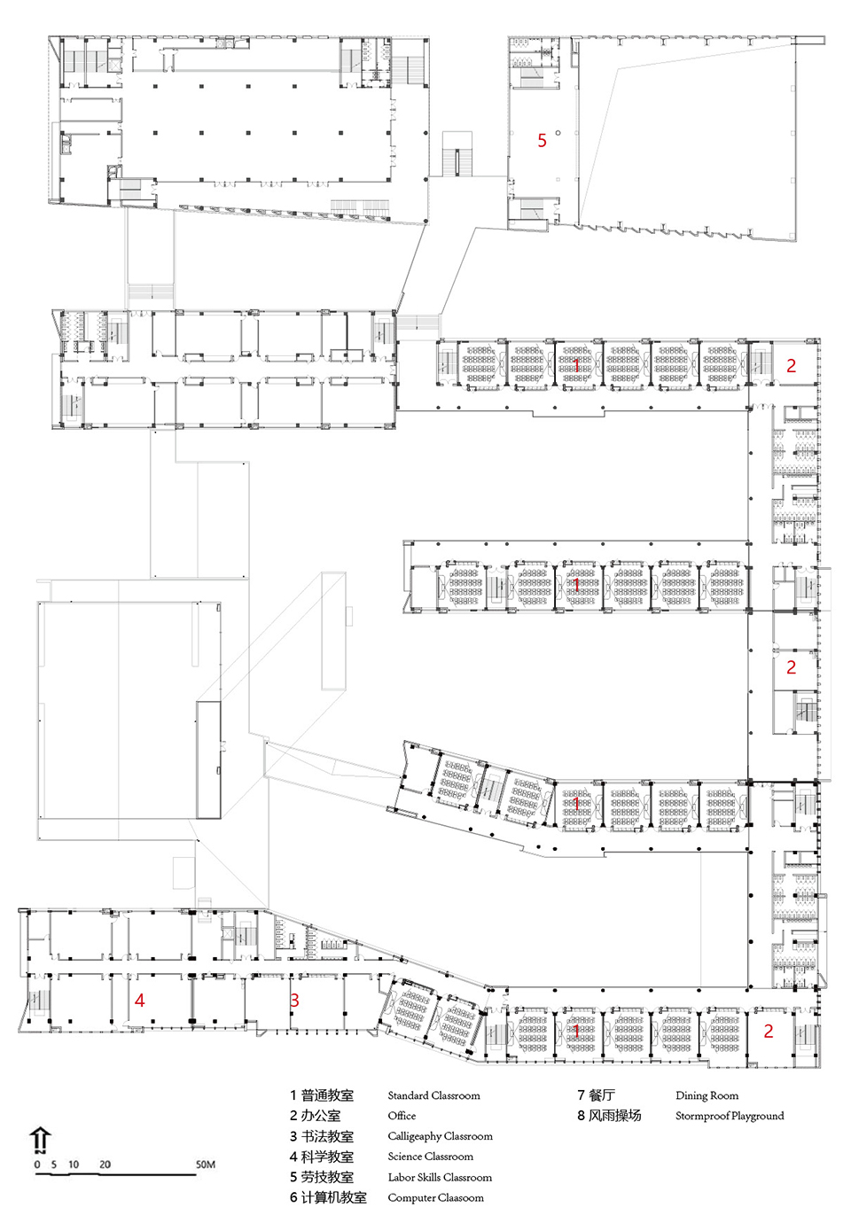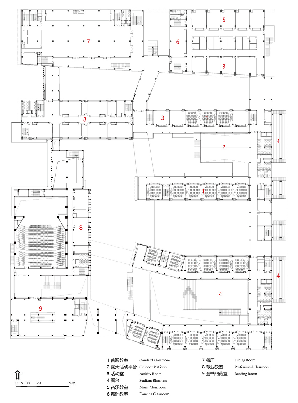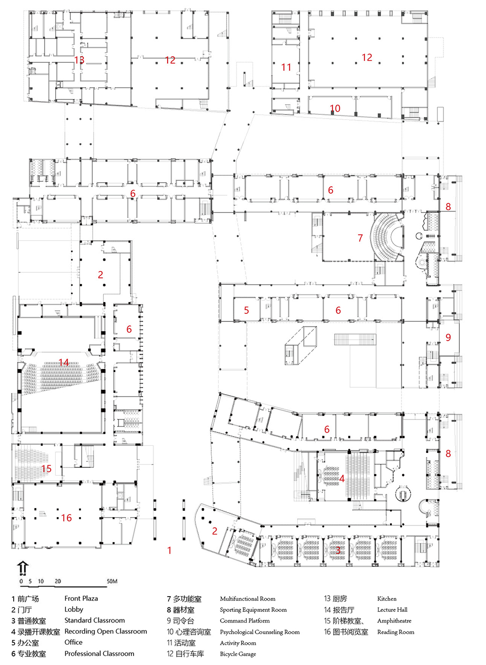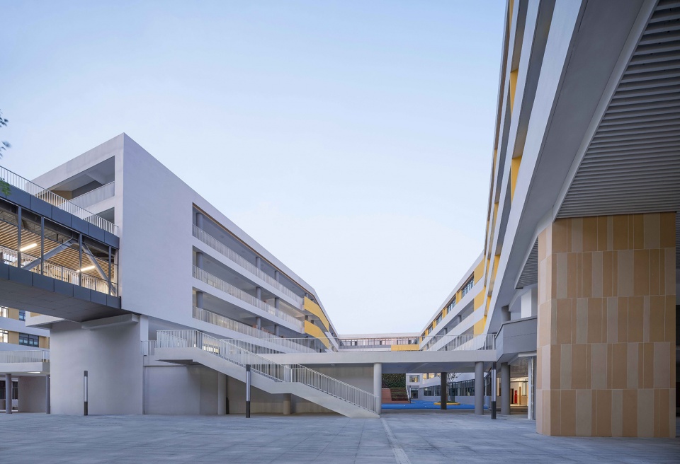 项目整体布局选取分而不隔的院落作为空间设计的原型——传统的院落空间再面对城市具有的内向型和面对自身具有的互动性方面与这个项目希望达成的愿景是相似的,形成由教学建筑以及其他教学用房围合形成的庭院式院落校园空间。我们将一些功能空间进行了整合,形成了沿着城市道路的综合体建筑,形成了丰富的各种形态的院落,共同构成了这所 “轻盈灵动”的开放式校园。