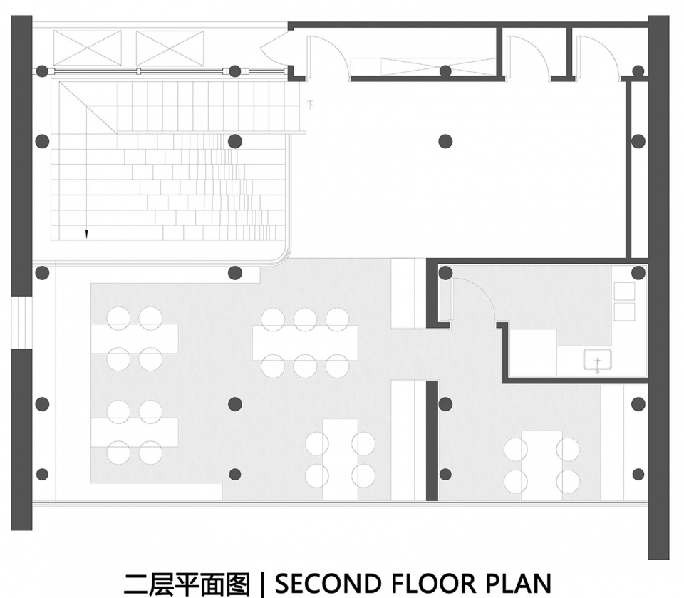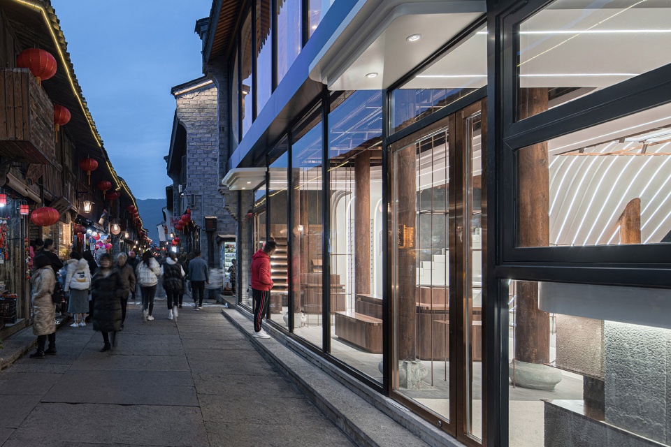 设计团队将沿街面的门窗全部拆除,用黑色不锈钢框架配以大面积落地门窗取而代之,让原本昏暗狭小的空间变得明媚而通透,巨浪从二层喷涌而出,向古街注入现代气息,使店铺从紫阳街脱颖而出。
