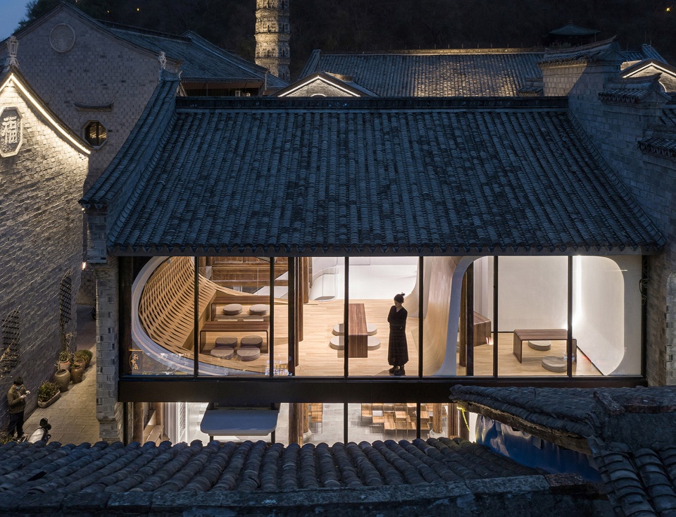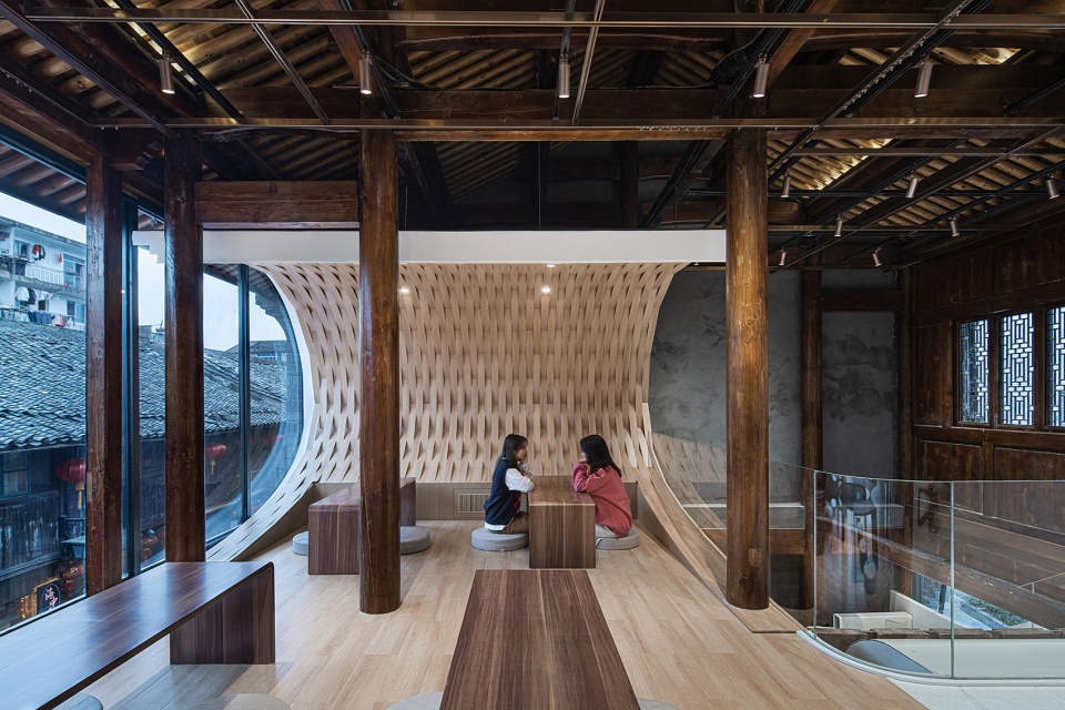 Proposing the special concept of new rising “Wave” symbolizing the young generation, the design team has subtly placed the element of abstract wave in the old house. By contrasting the new and the old sharply, it has created a wonderful surreal art scene, expressed a marvelously intrepid and free attitude of the contemporary young riding the wave, and thus effectively set up a diverse and vast space full of fun. At the same time, the distinct design concept of “Wave” finely echoes the real surging tide in the Lingjiang River outside Linhai city, on account of which the ancient city wall with the additional and reliable flood-control function can astonishingly survive and even be well preserved in the densely populated area after a thousand years.