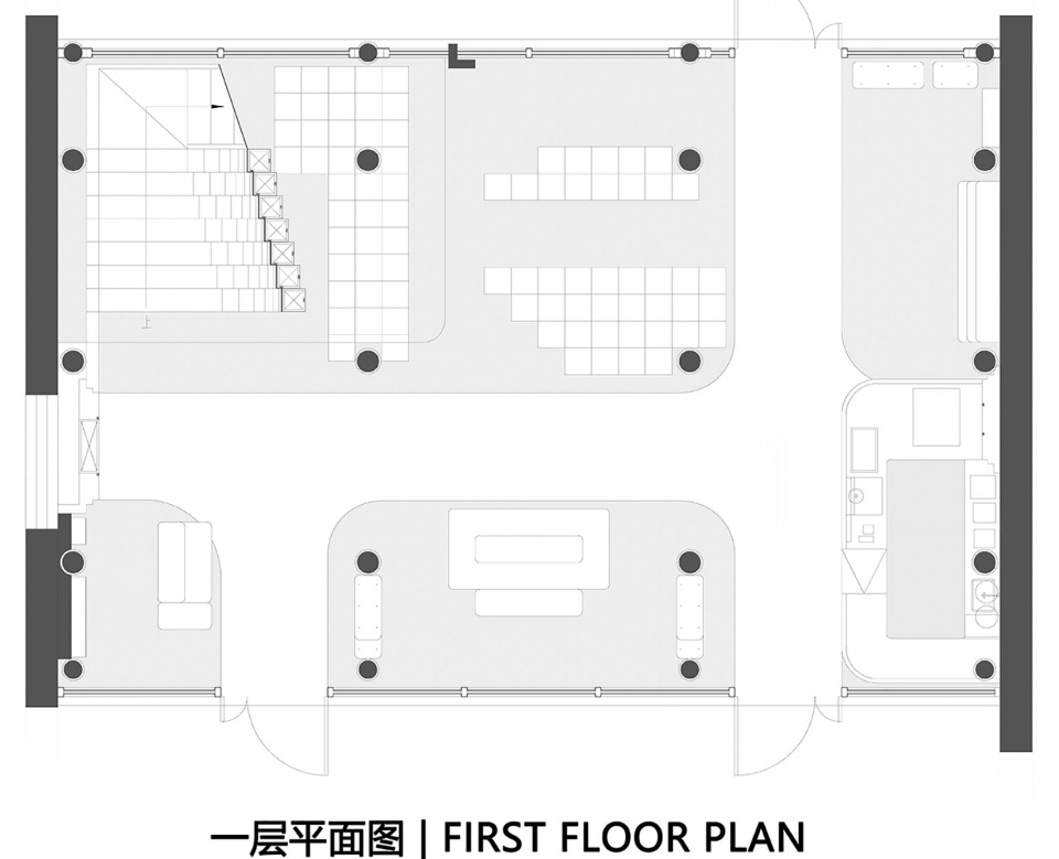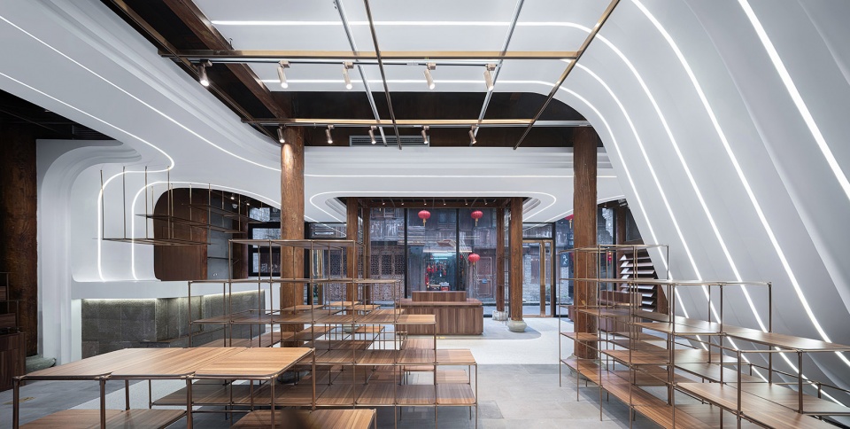 Decidedly replacing all the doors and windows along the street with the large floor-to-ceiling ones and the black stainless steel frames, the design team has remarkably made the originally dark and narrow space become bright and transparent, and contributed to the huge “wave” pouring out from the second floor, as if infusing a modern vital pneuma into the old street. The whole design has already resulted in its significant distinction from other stores.