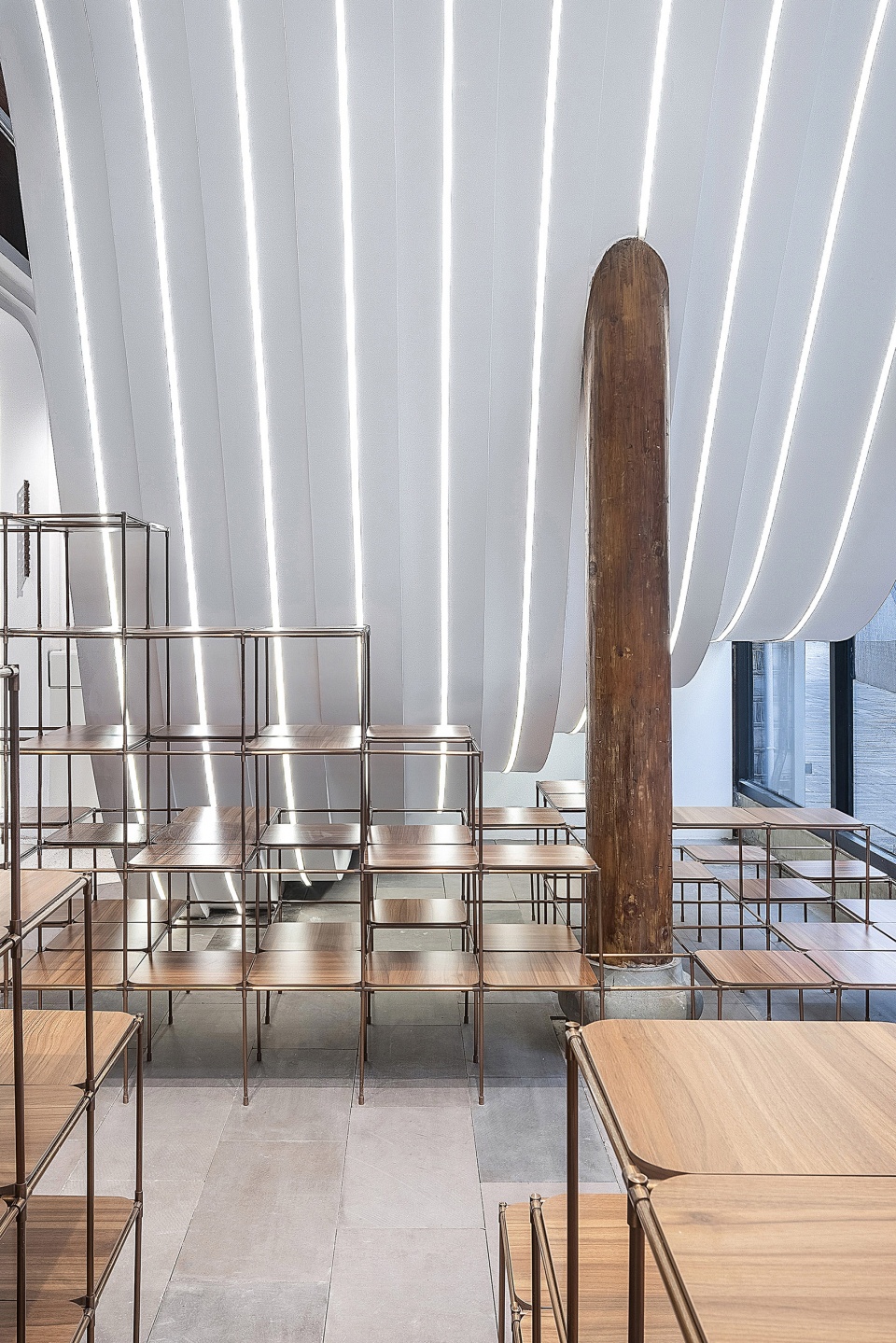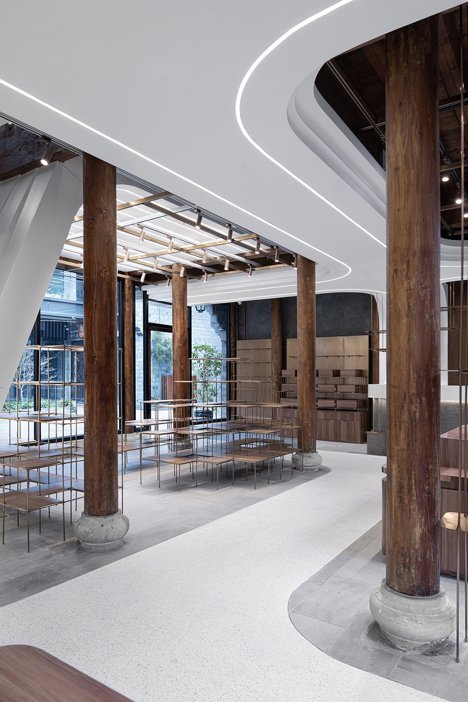 By means of thoroughly dismantling the jumbled and redundant walls and simply exposing the original wood structure and wall materials, the design team has placed a continuous white curved surface, which like a leaping wave, between the beams and the columns, and thus hidden inside the surface the equipment pipelines, the electrical lines, etc., so that the sight can be much clearer, purer and simpler without any confusion.