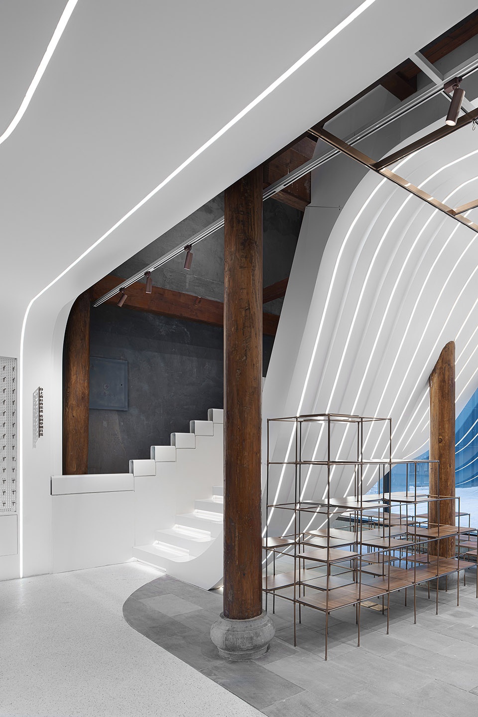设计团队拆除冗杂的墙体,将原有的木结构和墙体等材料简单的暴露出来,在梁柱间置入犹如跃动的浪头翻涌的连续白色曲面,将设备管线、强弱电线路等隐藏其中,让视线可及处变得更加纯粹简约。