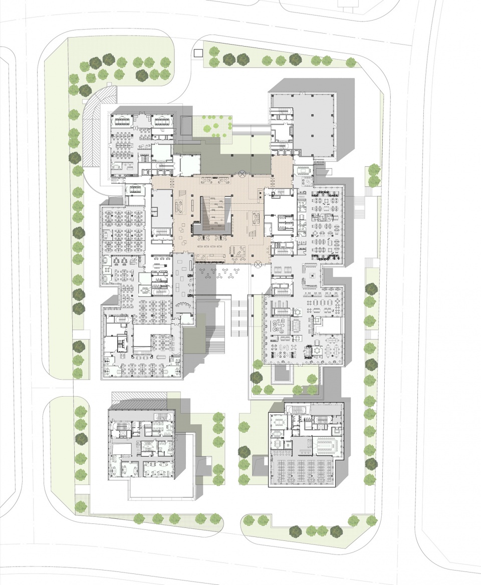 模块化设计应需而生。通过调研设计院各部门的人员规模和工作特点,寻找到适合大小部门需求的空间“公约数”——每个单元模块为33.6m*33.6m(约1000㎡),轴网均采用8400*8400mm,再将多个33.6m见方的单元模块进行组合,根据不同需求进行区域划分。建筑内部的核心筒集中设置在模块一侧,形成了“服务空间”和“被服务空间”的分化,“被服务空间”空间开阔连续,方便未来弹性调整。同时,空间的模块也为机电系统的模块化、标准化提供了前提与基础。
