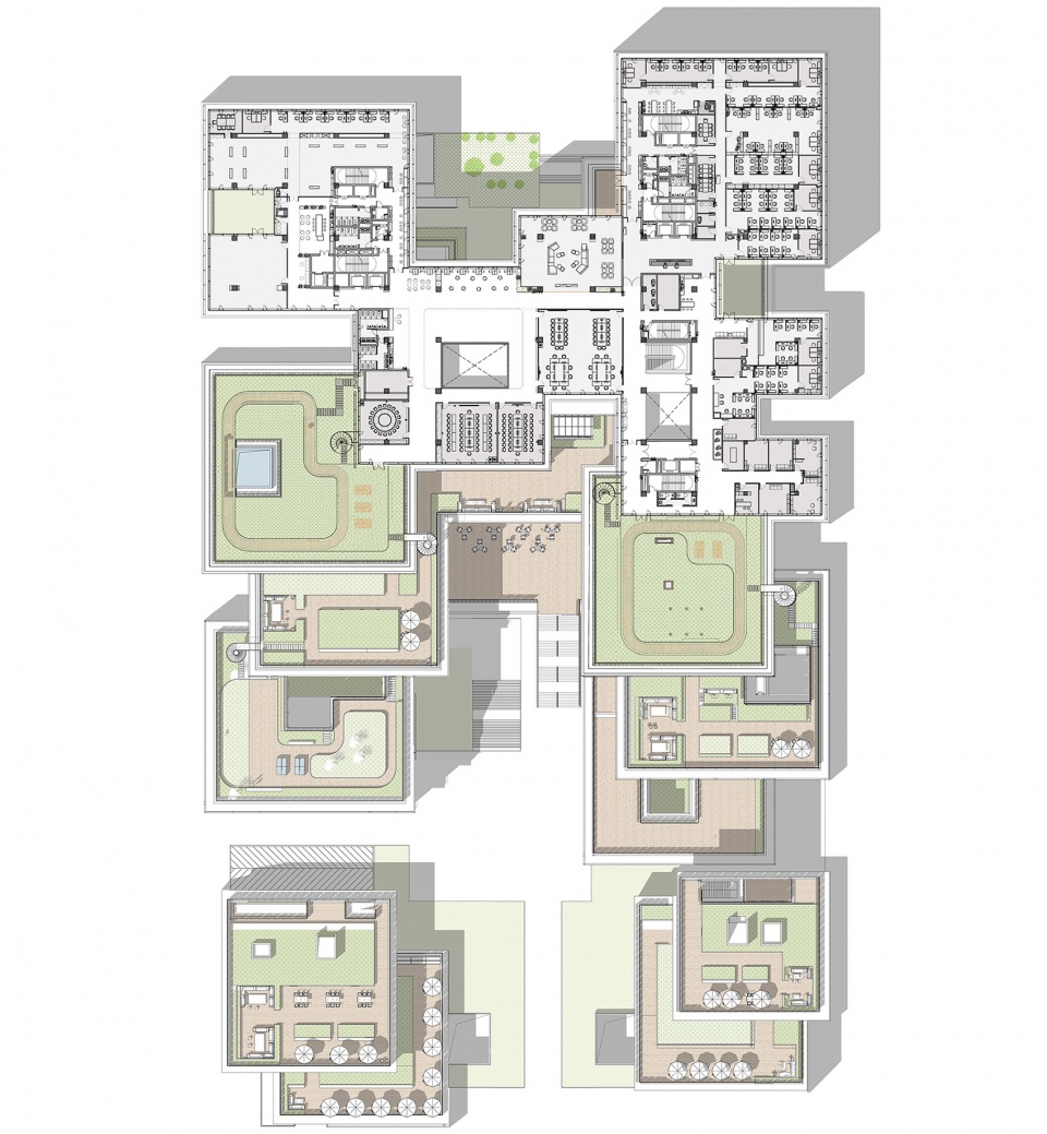 屋面的室外步行体系由各个平台间的螺旋钢梯与花园小径连接而成,提供了另一种动线选择。屋顶布置了瓜果蔬菜的种植场地,1000平方米的太阳能板,以及空中篮球场、羽毛球场,迷你跑道,甚至设计了一条从地面到屋面的立体微型马拉松环线,作为室外运动的趣味项目。人穿行于平台风景之中,模糊了工作与生活的界限,传递出创意设计企业的特有氛围。