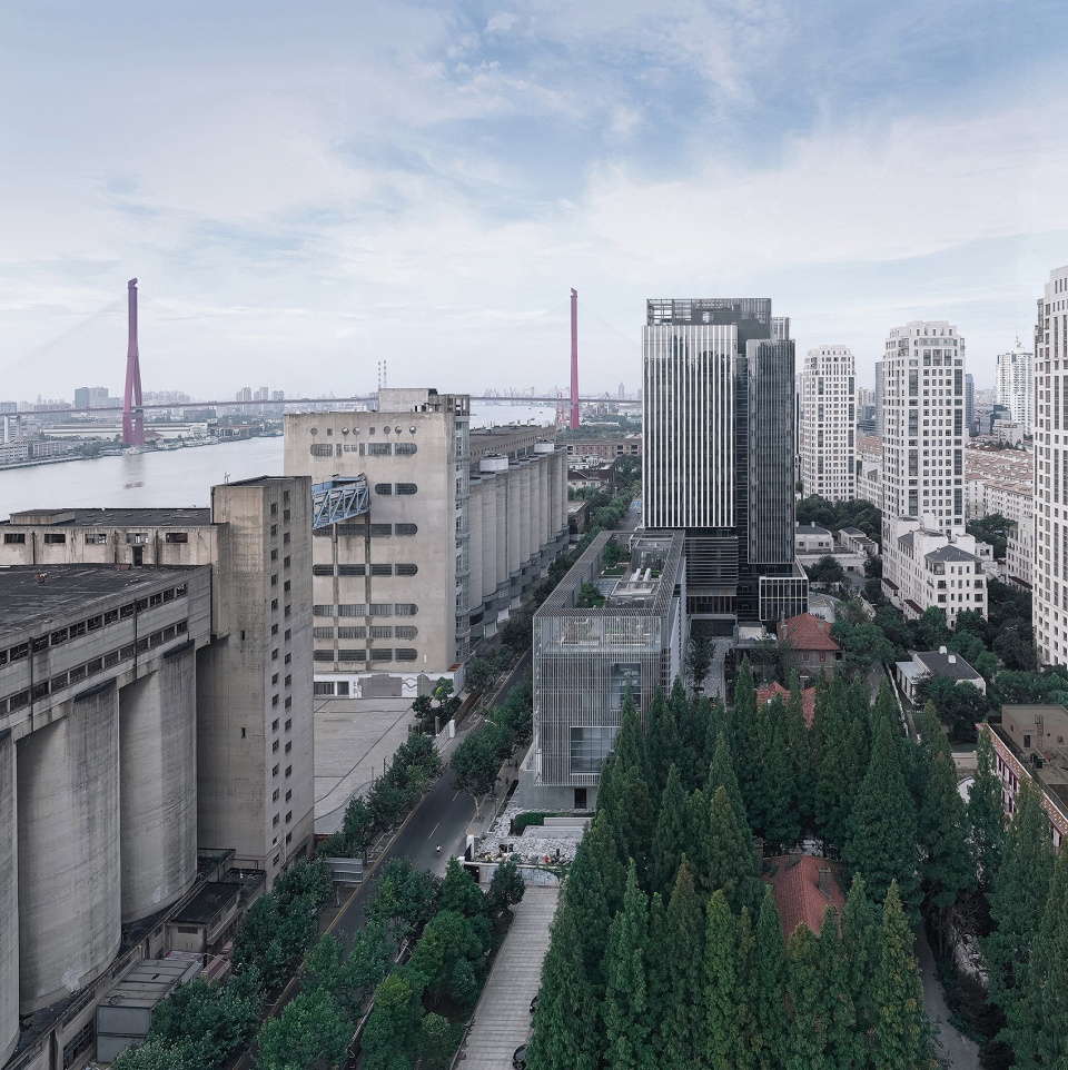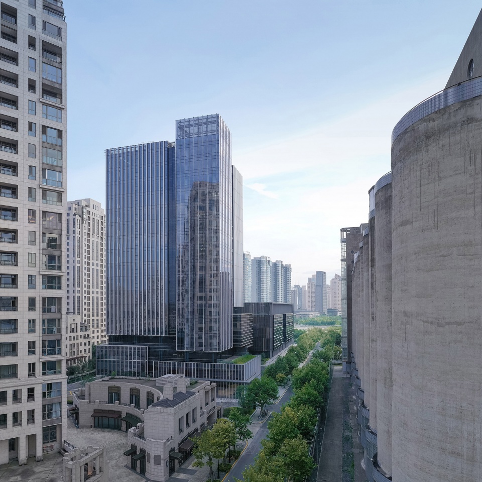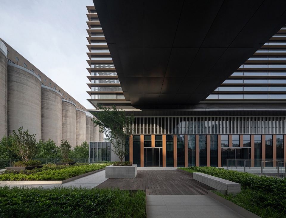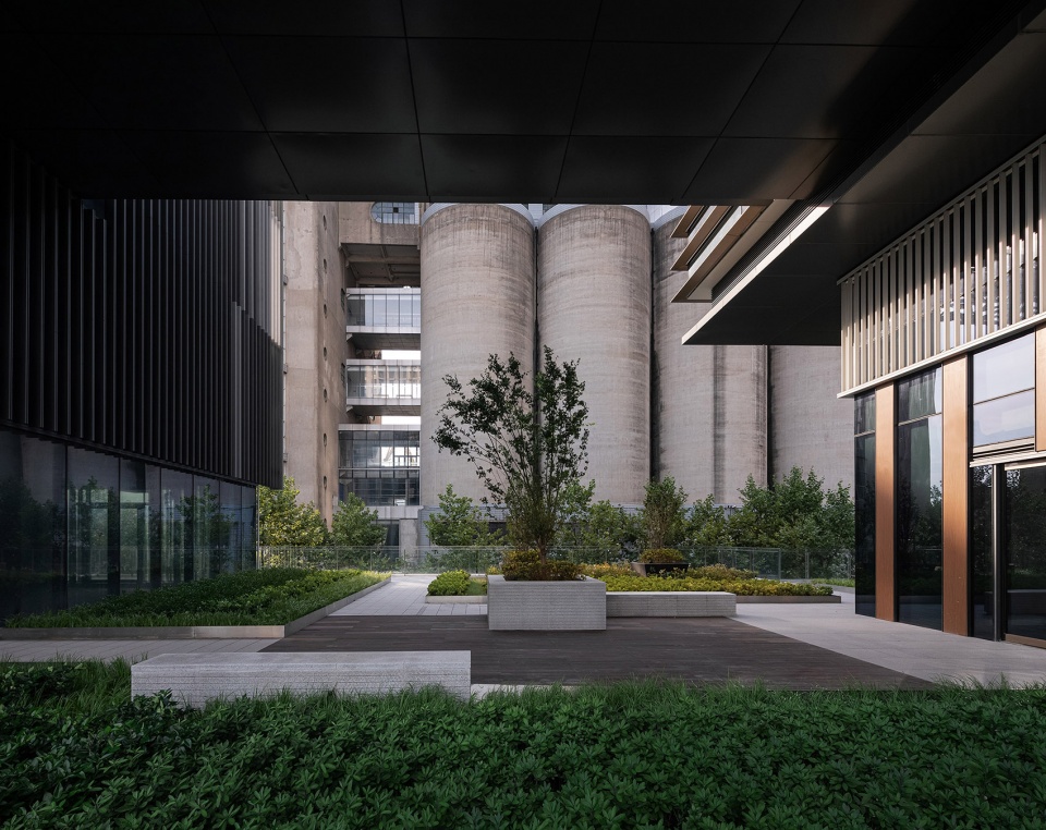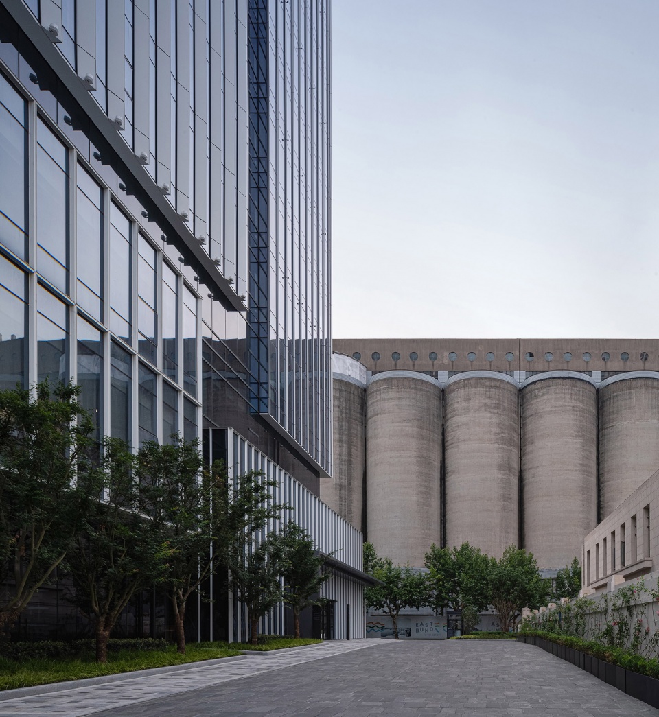 建筑中的对位关系和传统园林中框景的手法也被巧妙应用在项目中。塔楼四个竖向的空间体量与筒仓的体态相呼应、东高西低的高度变化与周边建筑的体量相呼应、建筑立面横纵栅格清晰的几何划分与工业旧址氤氲的气氛相呼应。