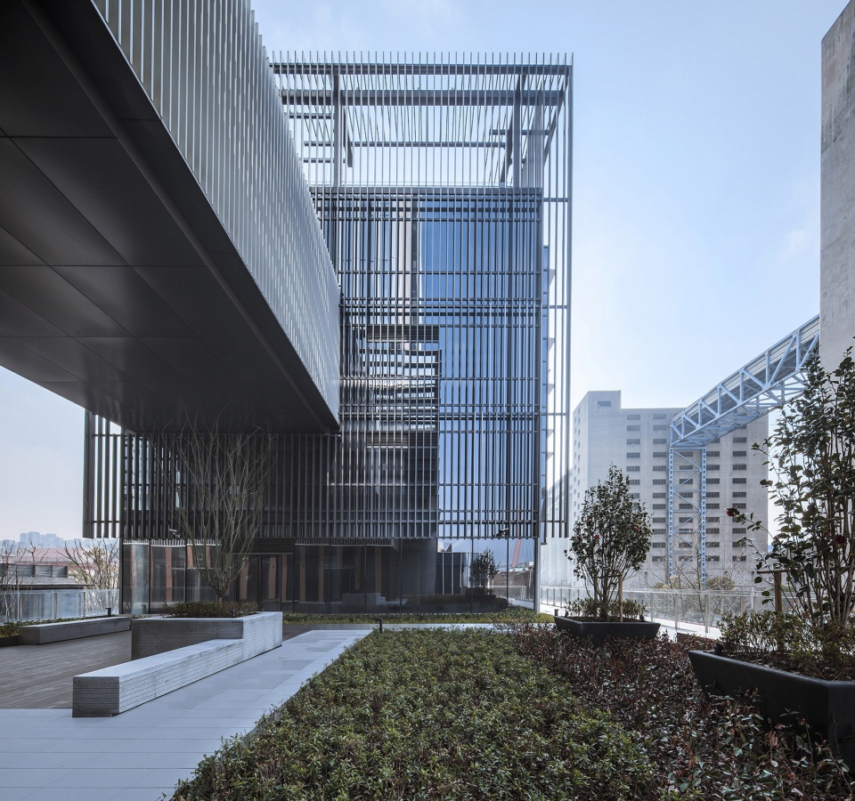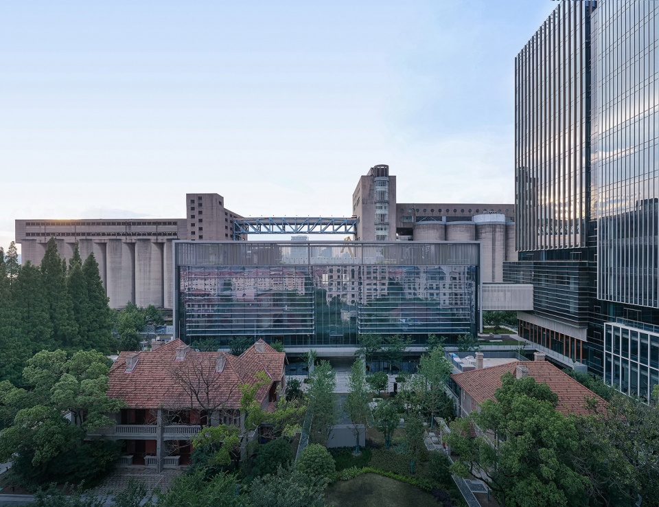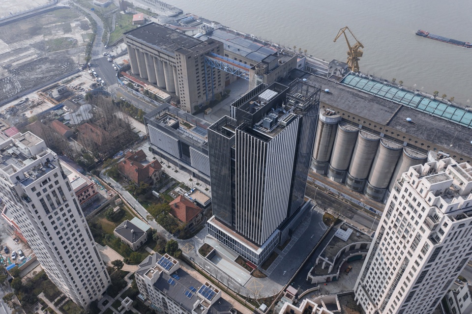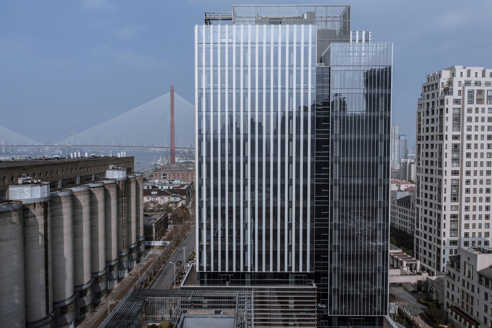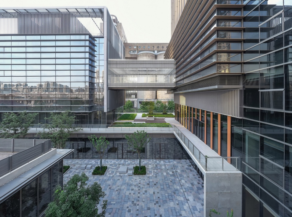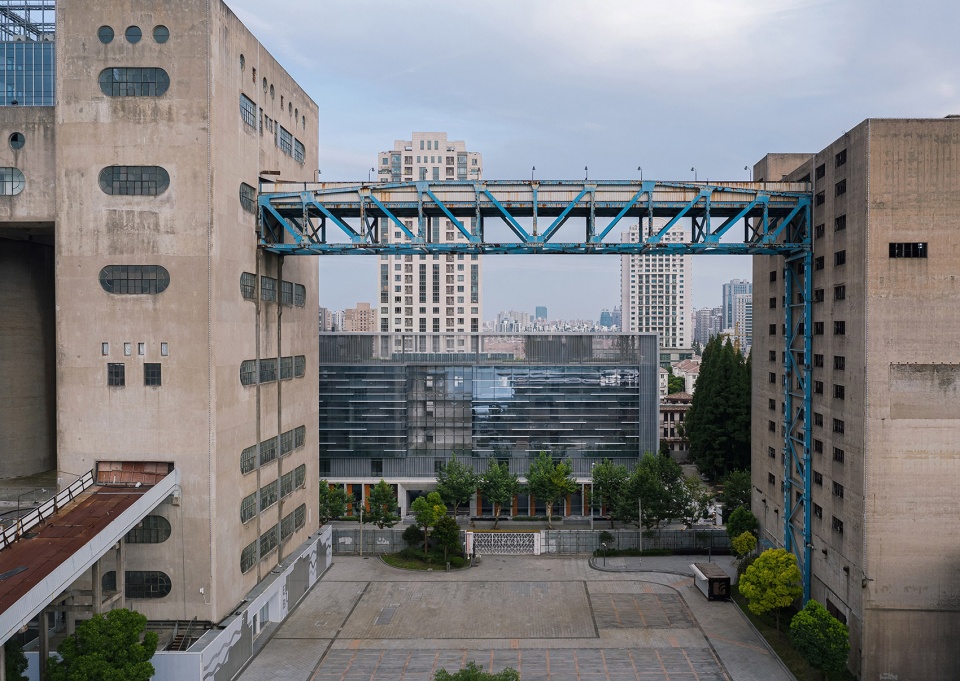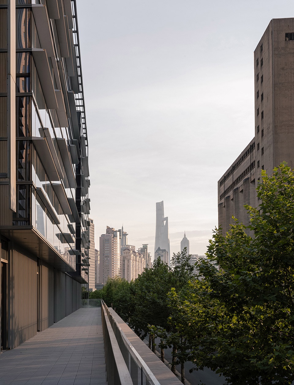 建筑中的对位关系和传统园林中框景的手法也被巧妙应用在项目中。塔楼四个竖向的空间体量与筒仓的体态相呼应、东高西低的高度变化与周边建筑的体量相呼应、建筑立面横纵栅格清晰的几何划分与工业旧址氤氲的气氛相呼应。