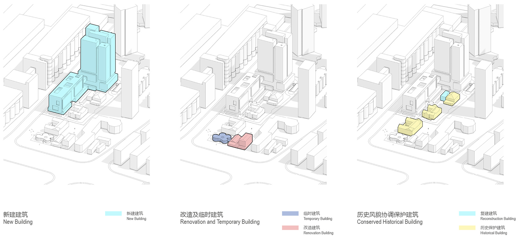 E15-3街区城市更新项目历时六年, 设计介入的范围包括:新建L型地块中华企业办公及配套, 基地西侧地块老建筑的办公空间改造,历史文保建筑的风貌协调与基地内部街区营造, 以及西侧临时建筑文化艺术空间的植入。