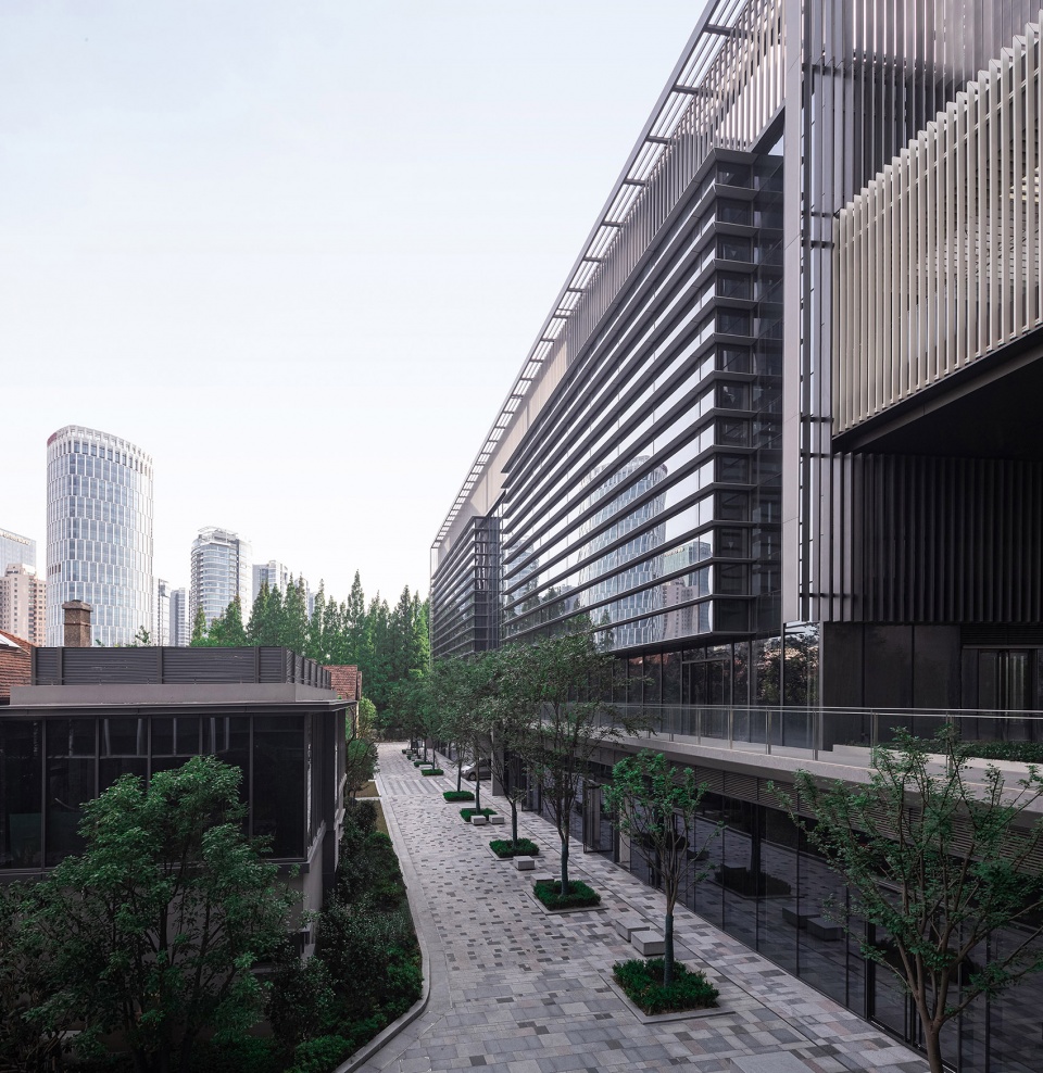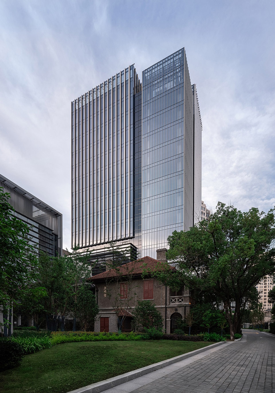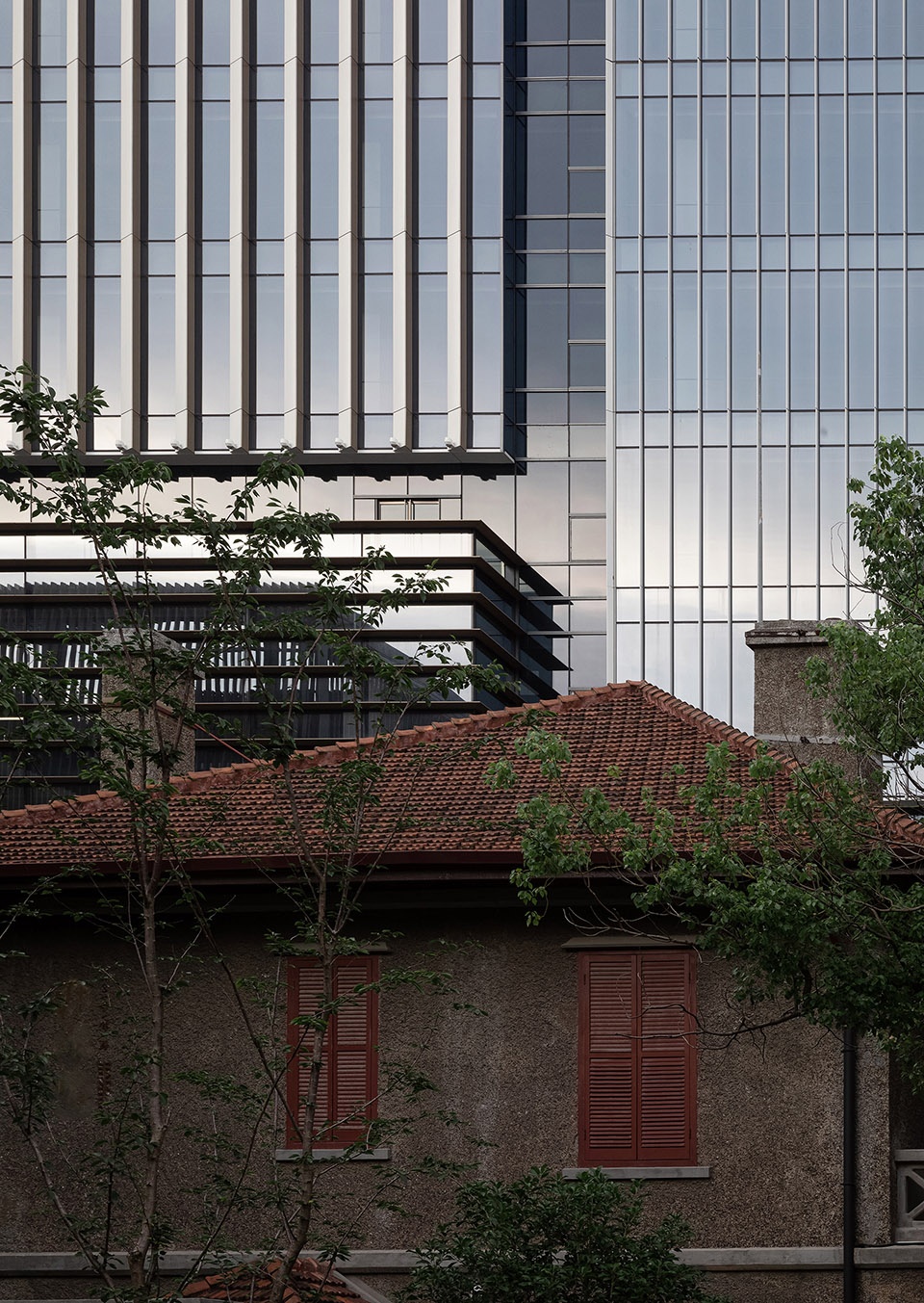 在整体设计策略上,塔楼拉高整体高度、减小标准层的面积,偏心设置核心筒,以争取最优化的景观条件,于建筑高区可以俯瞰整个黄浦江景;还有部分办公空间以顺极而流的形态,被延续折叠成亲切宜人低层的体量,以此呼应南侧低矮的文保建筑群,楔入场地中,作为内部界面与周边建筑共同打造新的街区,塑造城市空间新旧肌理融合交织的新格局。
