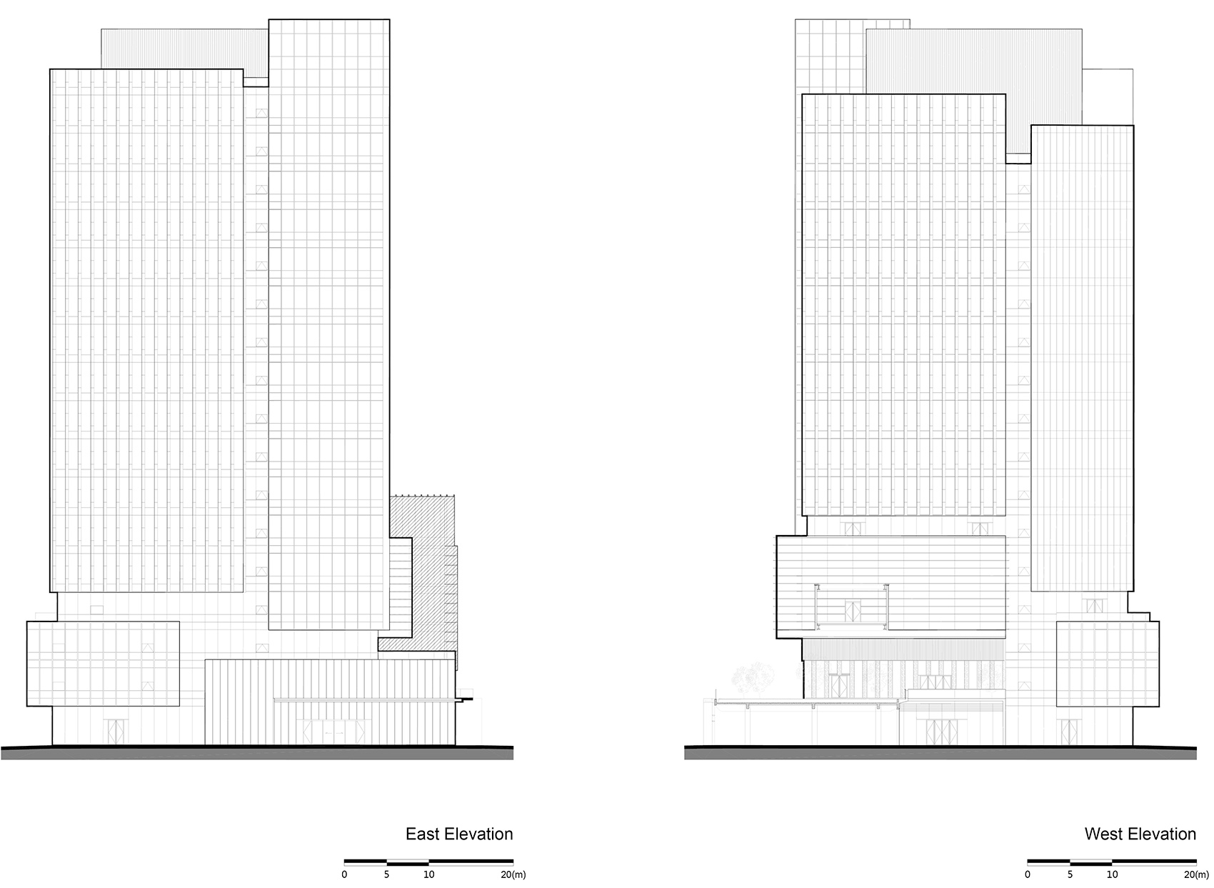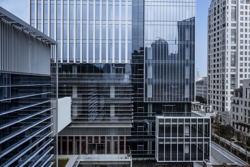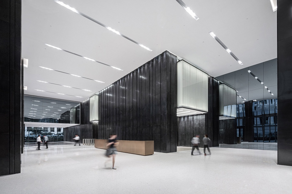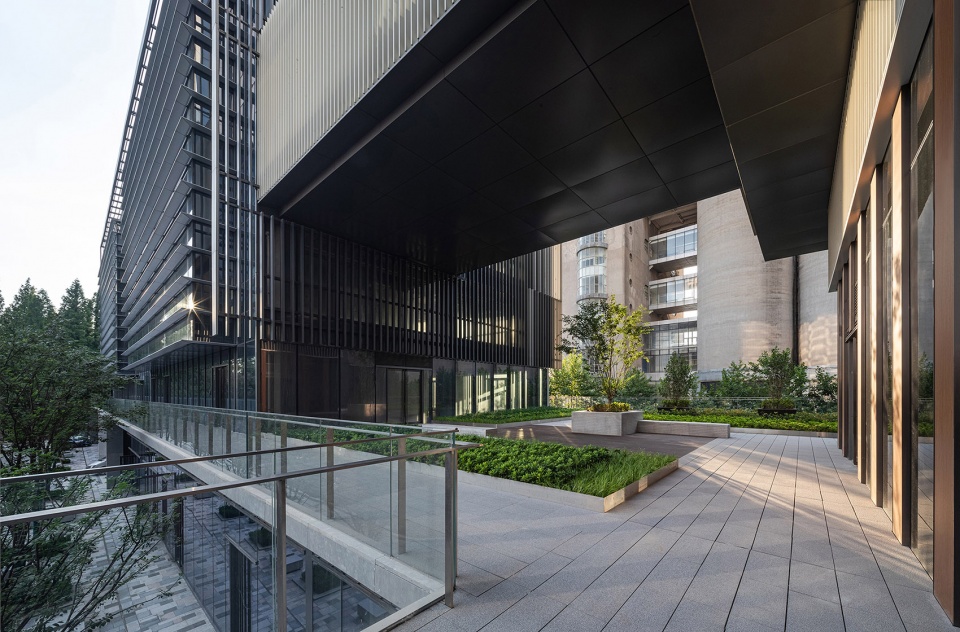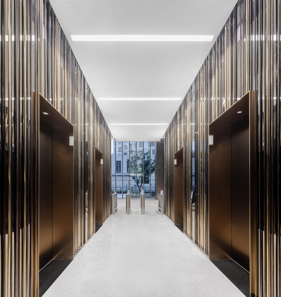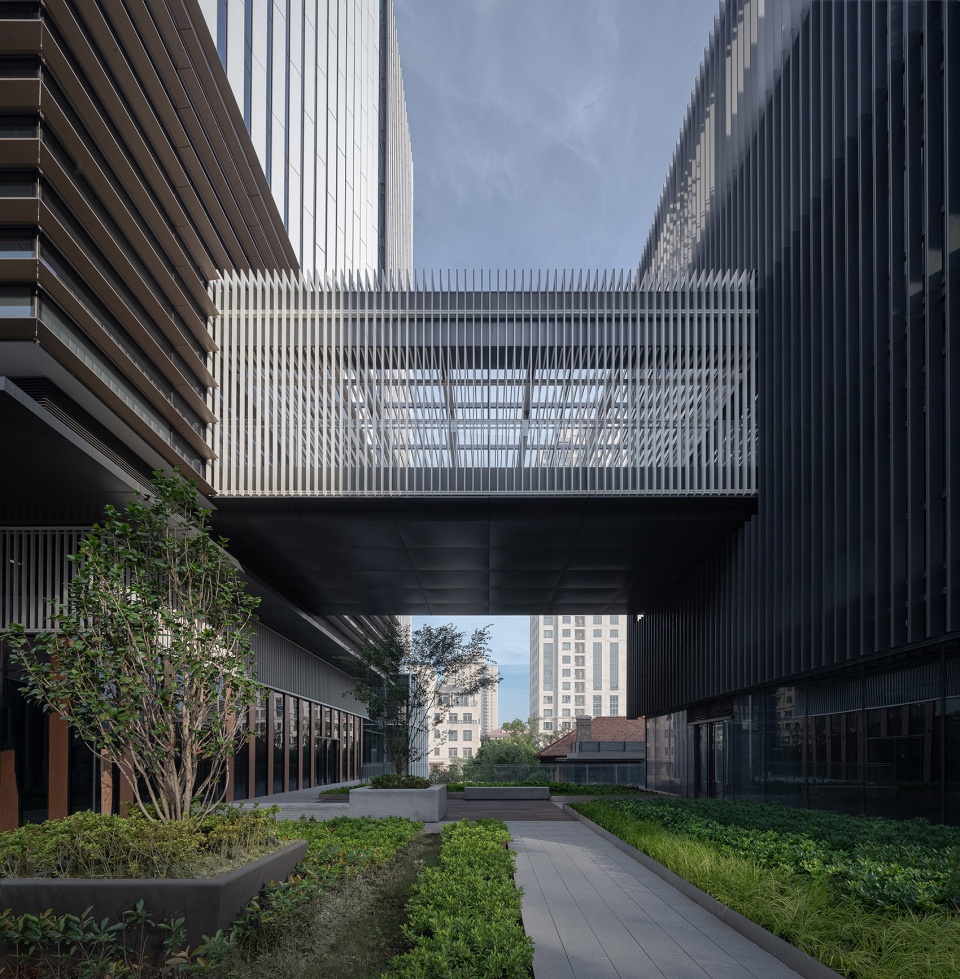 同时,面向住宅的部分采用7%反射率的节能LOW-E玻璃,防止光污染,降低对环境的影响。当四周建筑映射在塔楼的抽象体量上,疏密有致的分割构件随时间行进成为一组光影变奏曲,时间、城市与建筑建立起更感性的联系。