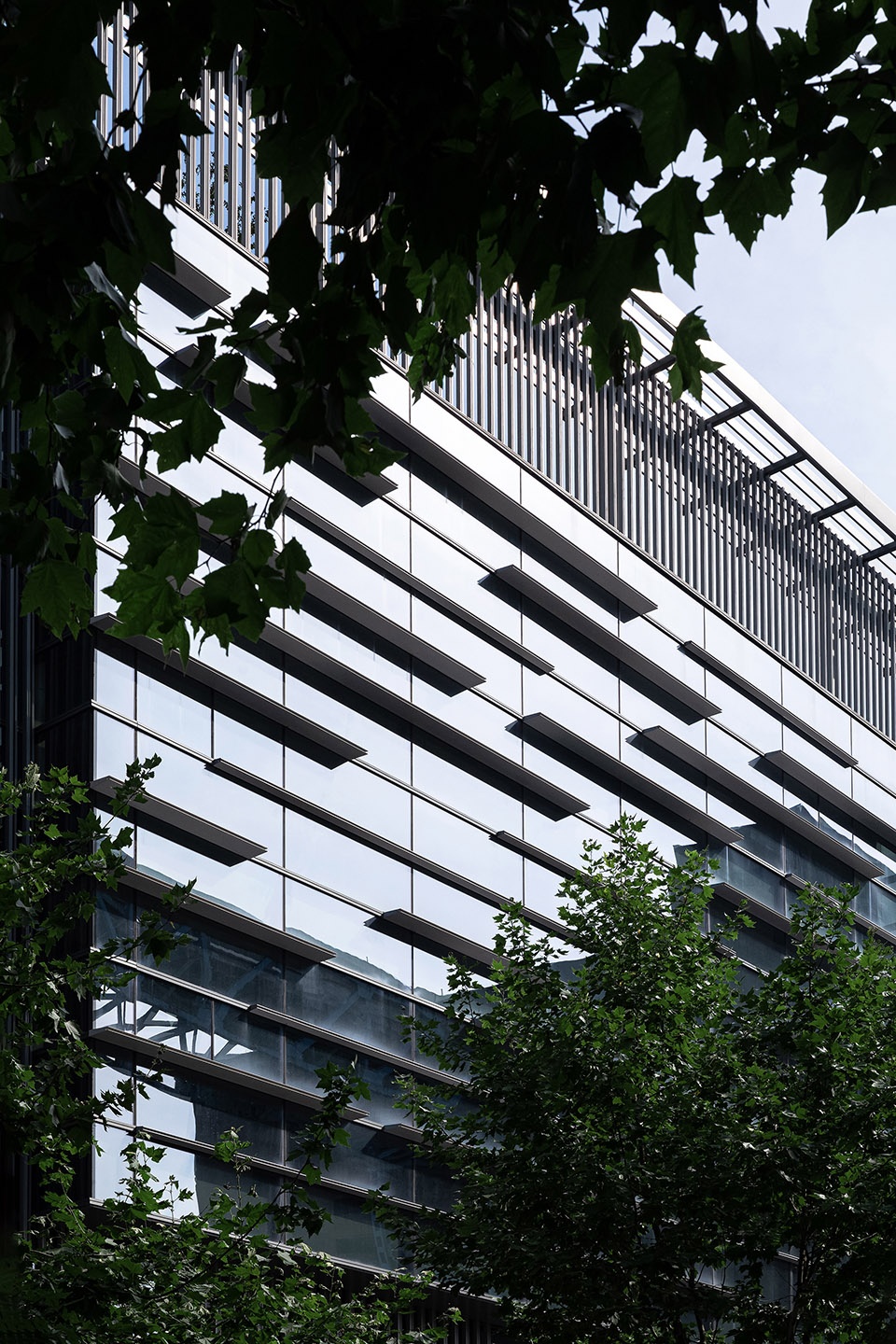 幕墙之上的实体部分根据周边建筑肌理和形态,优化四个竖向体量各立面的设计模数,竖向节奏变换形成不同韵律,在比例上呼应周边形态风格各异的建筑群。根据朝向,建筑师进一步调整幕墙杆件尺寸,以平衡室内光线亮度,柔和采光。