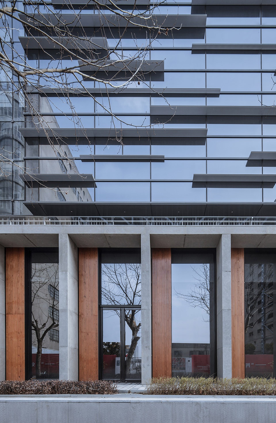 Different from traditional office buildings, the urban renewal project of E15-3 block selects Moroccan gray limestone at the urban interface, and the dumb and low-key gray tone corresponds to the concrete material of the silo. The vertical and horizontal line details on the tower are made of warm colors such as metal copper and logs, which is well integrated with the surrounding historical building atmosphere in terms of space color character. At the same time, industrial building elements are used in the design details of the horizontal corridor and the facade grid of the public platform facing the silo, which not only has fine texture and natural texture, but also continues the spirit of the people's livelihood wharf, giving the building more readability.