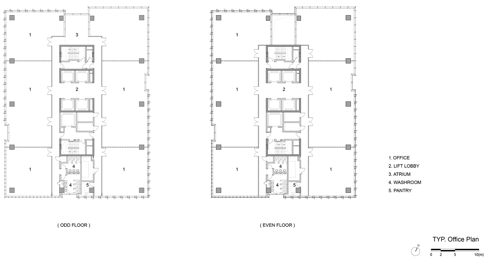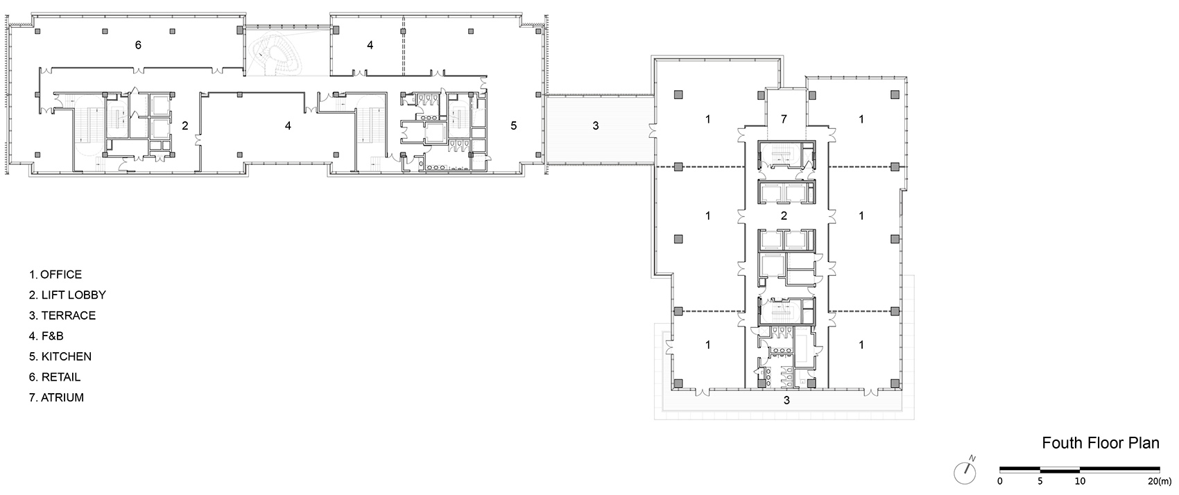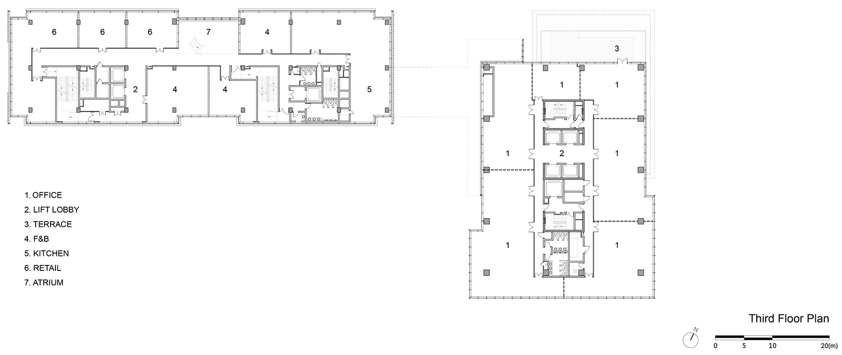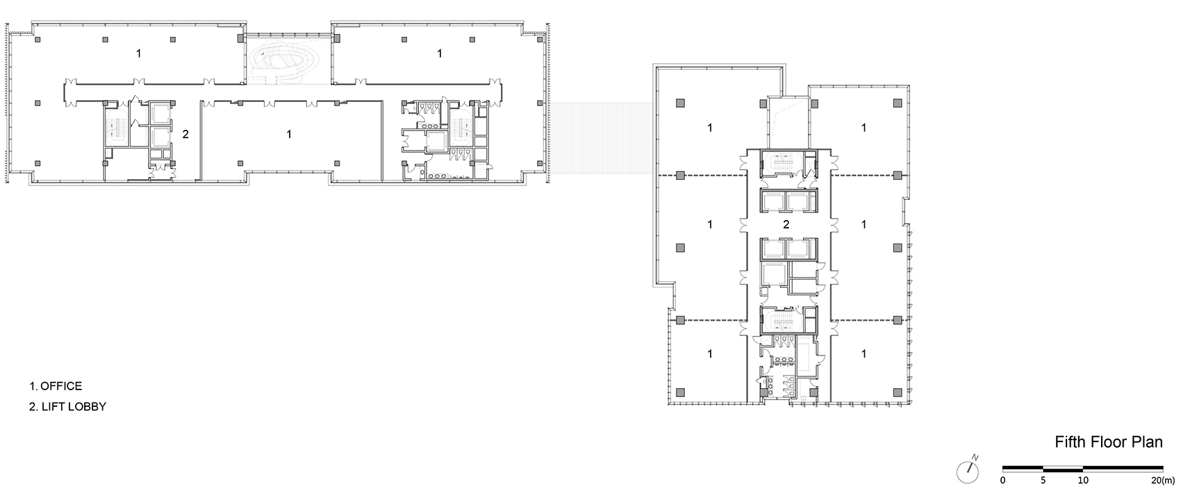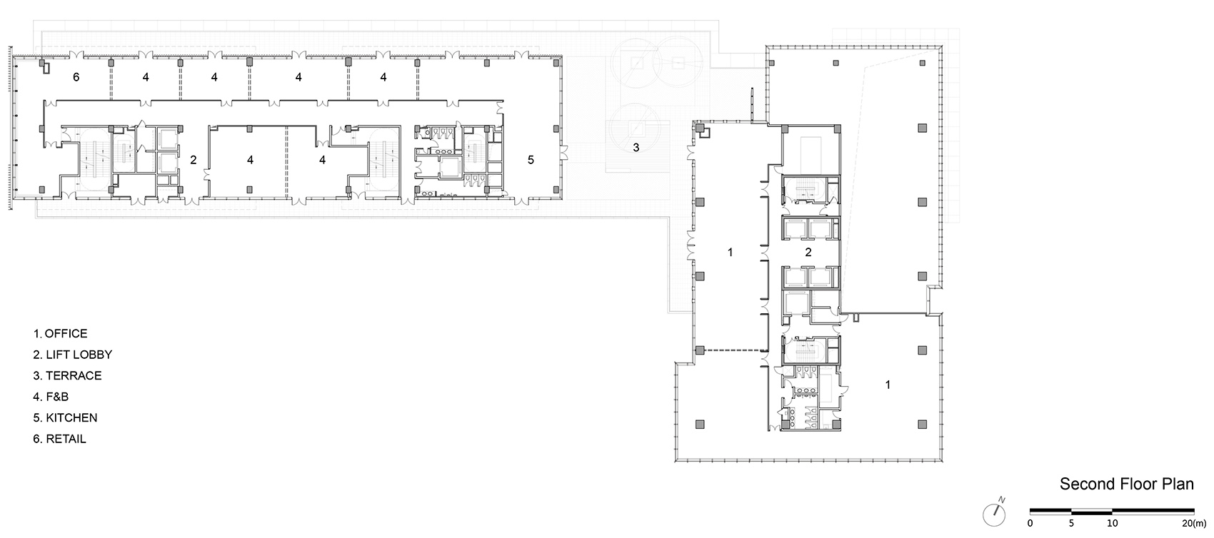 塔楼和裙楼之间以较纤细的横向通廊相连接,除了满足建筑本体内交通的便捷性,在更大图景上对西北侧体量韵律感极强的筒仓项目起到了“对话”与“破题”的作用——“空间赋格”设计逻辑的核心得以体现:跃动起伏的变化中保持格调一致,简约体量的设计中以细节呼应。建筑师对E15-3街区城市更新项目的思考不仅仅停留在项目本体的设计,更关照到整体周边环境,在意“新生”的空间对城市生活的意义。