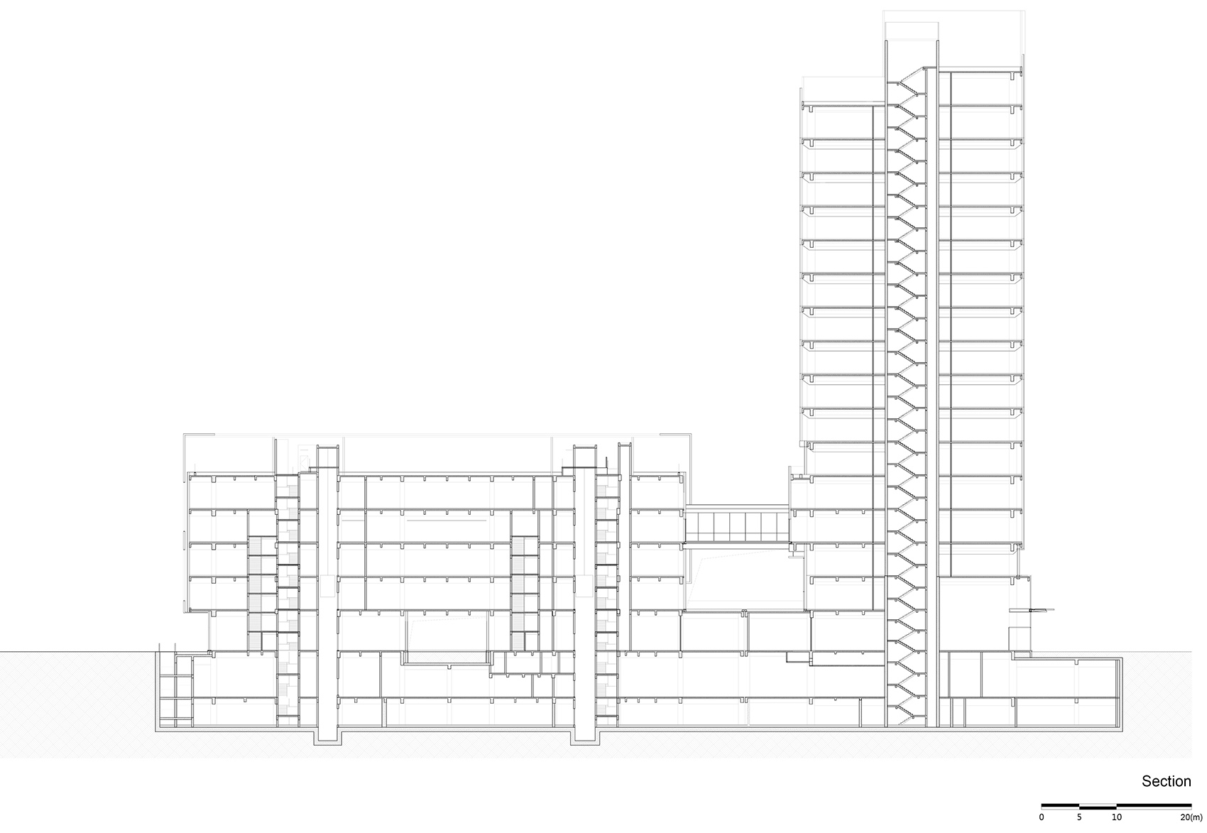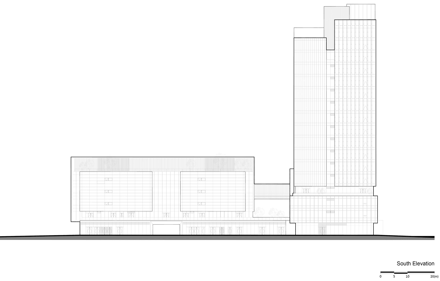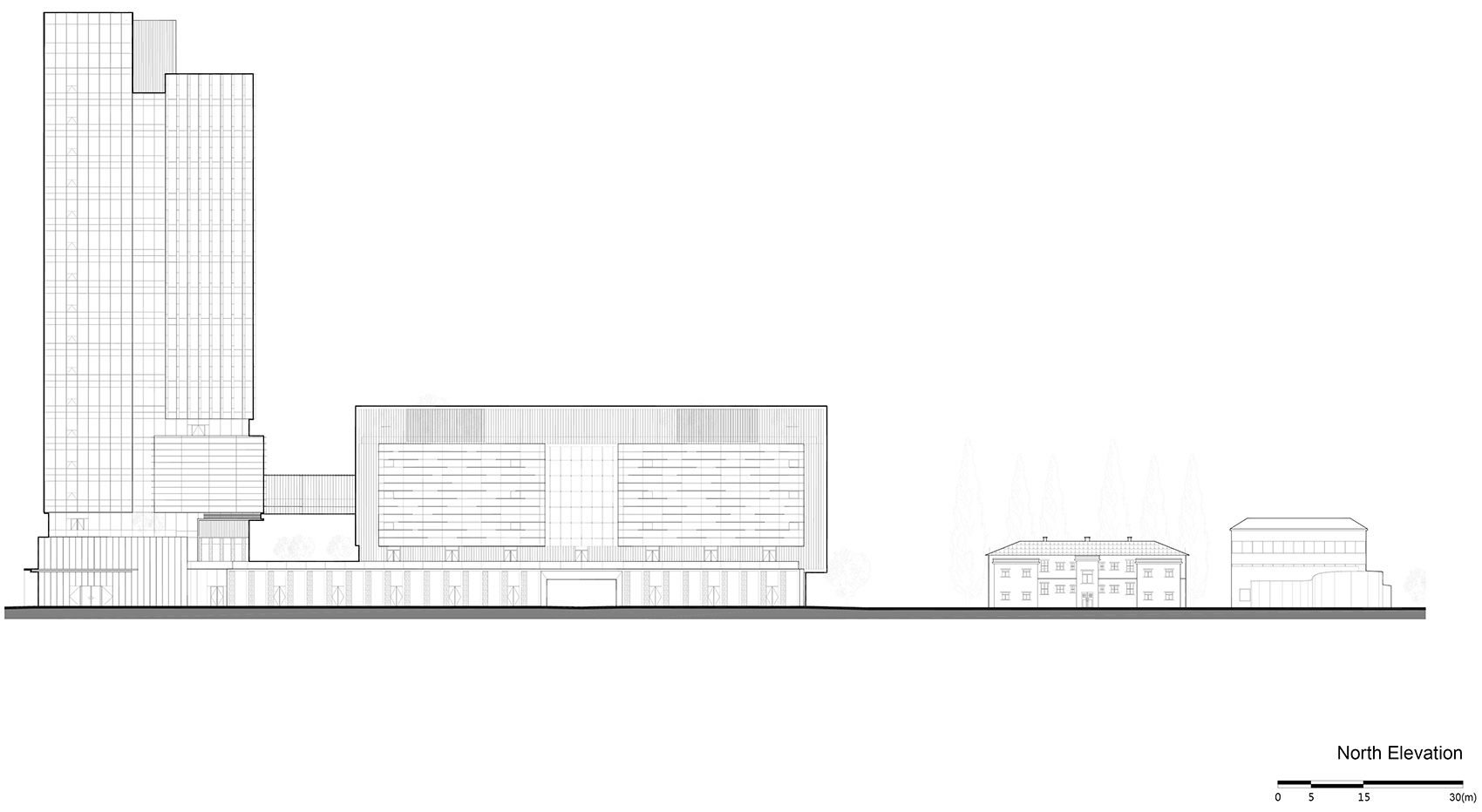 The tower and podium are connected by a thin horizontal corridor. In addition to meeting the convenience of traffic in the building body, they play a role of "dialogue" and "problem solving" for the silo project with strong volume rhythm in the northwest on a larger picture. The core idea of the "space fugue" design logic is reflected: keep the style consistent in the changes of the ups and downs, and echo the details in the design of the simple volume. The architects' thinking on the urban renewal project of E15-3 block is not only about the design of the project itself, but also about the overall surrounding environment and the significance of the "new" space for urban life.