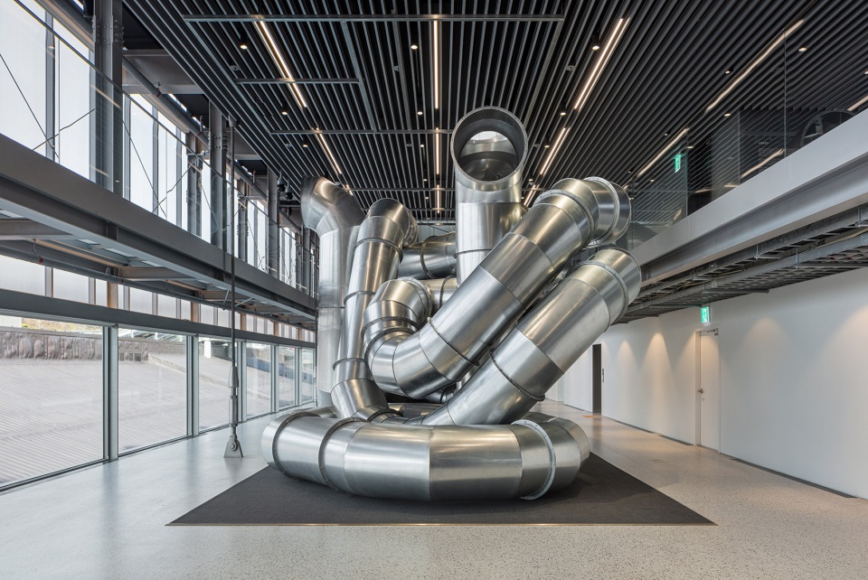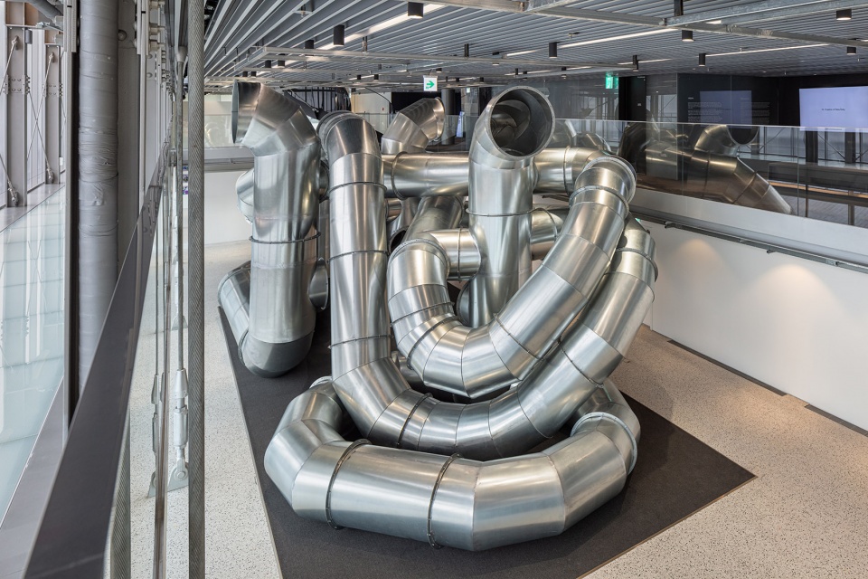 阈限城市是一个特意为釜山现代汽车工作室设计的装置,旨在激发画廊空间之间的相互作用。阈限城市的各个支管里都装有镜子,它们是个潜望镜系统,在整个画廊以及一层、二楼和夹层之间建立视觉联系。