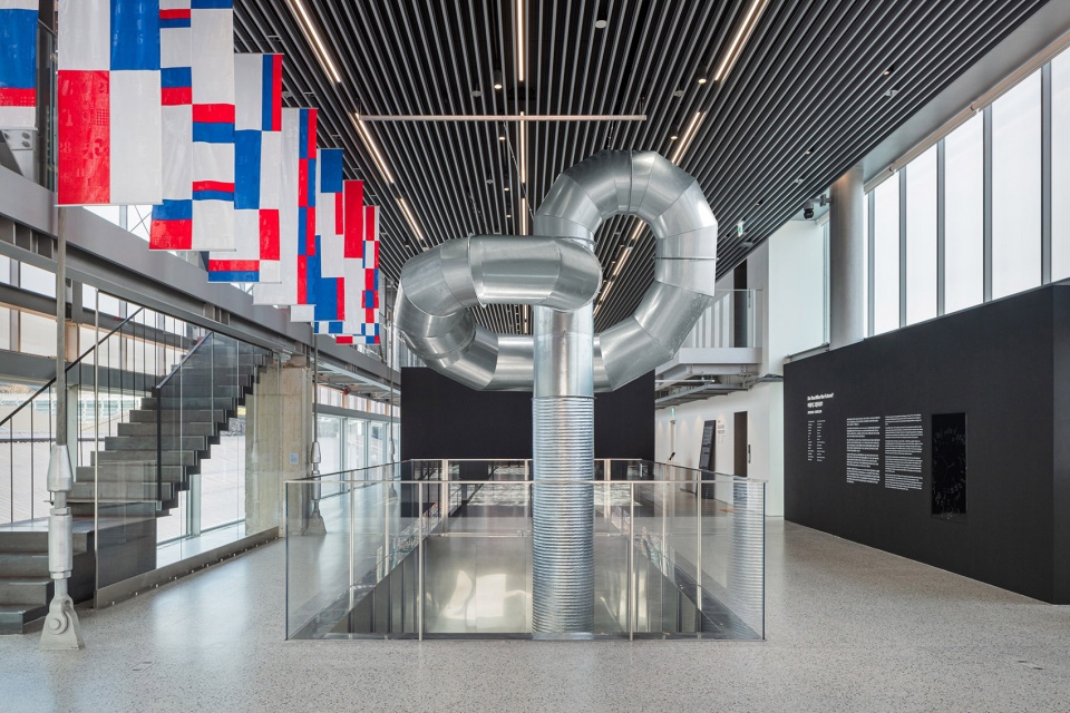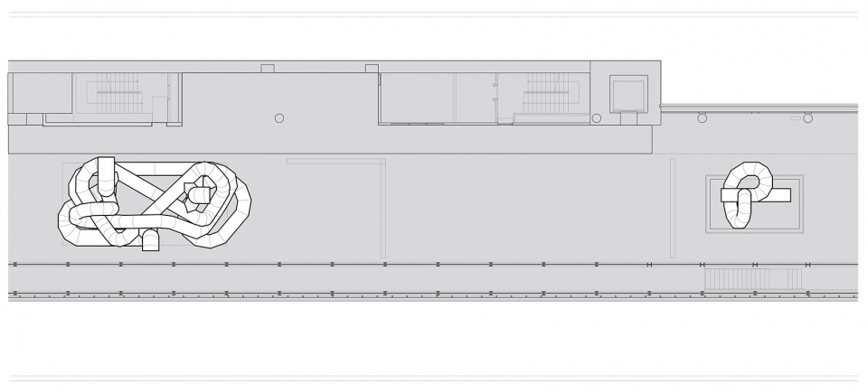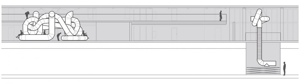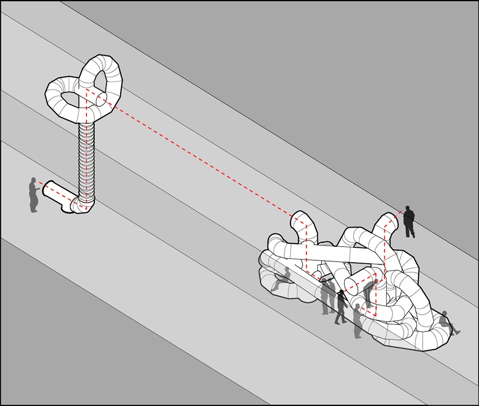 如今的现代建筑厚实,与室外隔绝,如没有用于传送空气的管道设施,室内将无法维持生活。阈限城市表达了一个可被使用和探索的中间地带,它由平时刻意被隐藏的元素(风管)构成,被排列组织,连接空间与时间的片段。