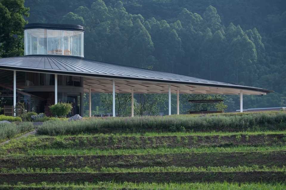 沿着梯田间的小路,一片轻盈的屋面在一圈细长柱子的支撑下,骤然现于眼前。与大多数“四水归一”的合院屋顶相反,在竹艺工坊的中央,一座二层高的环形玻璃“灯塔”突出于屋面之上,形成了可环顾周围乡村景致的接待空间,同时又不影响一层的空间组织。