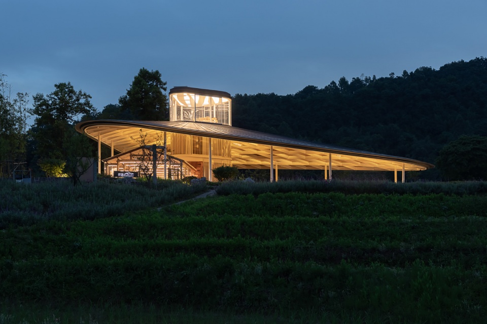 伫立于梯田的中央,竹艺工坊以其轻盈的姿态构成了安石村中的一处极具表现力的亮点。面对梯田和乡村,屋面在一侧低垂,从而拉近了建筑与大地之间的距离,而在另一侧则昂起,以容纳屋面之下的小房子以及功能所需的空间。傍晚时分,两个发光的“玻璃体”晶莹璀璨,亦通过光线的反射,照亮了屋面下如编织般的钢结构。屋面之下,“玻璃体”之外,流动的开敞空间亦为游客和村民提供了一处可自由使用的场所。