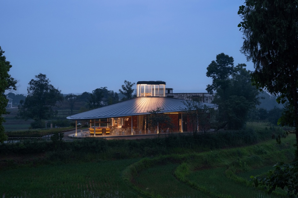 Standing in the center of the terraced fields, the Bamboo Craft Workshop with its light gesture constitutes an expressive highlight in Anshi Village. Facing the terraced fields and the countryside, the roof sags on one side, thus narrowing the distance between the building and the earth, and rises on the other side to accommodate the small house under the roof and the space required for the function. In the evening, the two luminous “glass bodies” shine brightly, and also illuminate the woven steel structure under the roof through the reflection of light. Under the roof, besides the “glass body”, the flowing open space also provides a place for tourists and villagers to use freely.