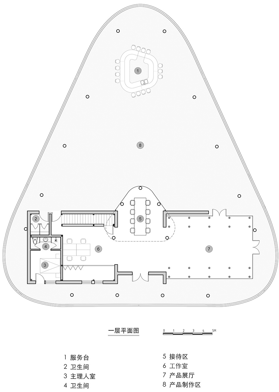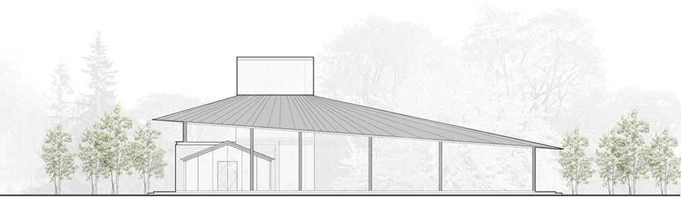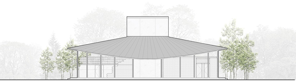 在中国传统乡村中,家庭式工坊往往采取“前店后厂”的模式,将售卖与制作融为一体。类似的,竹艺工坊也包括了研究、制作、展示和售卖的功能,它们被统领于一片呈圆角三角形的倾斜屋面之下,形成了一座面向城市游客的体验型工坊,同时也是村民学习技能的研习空间。