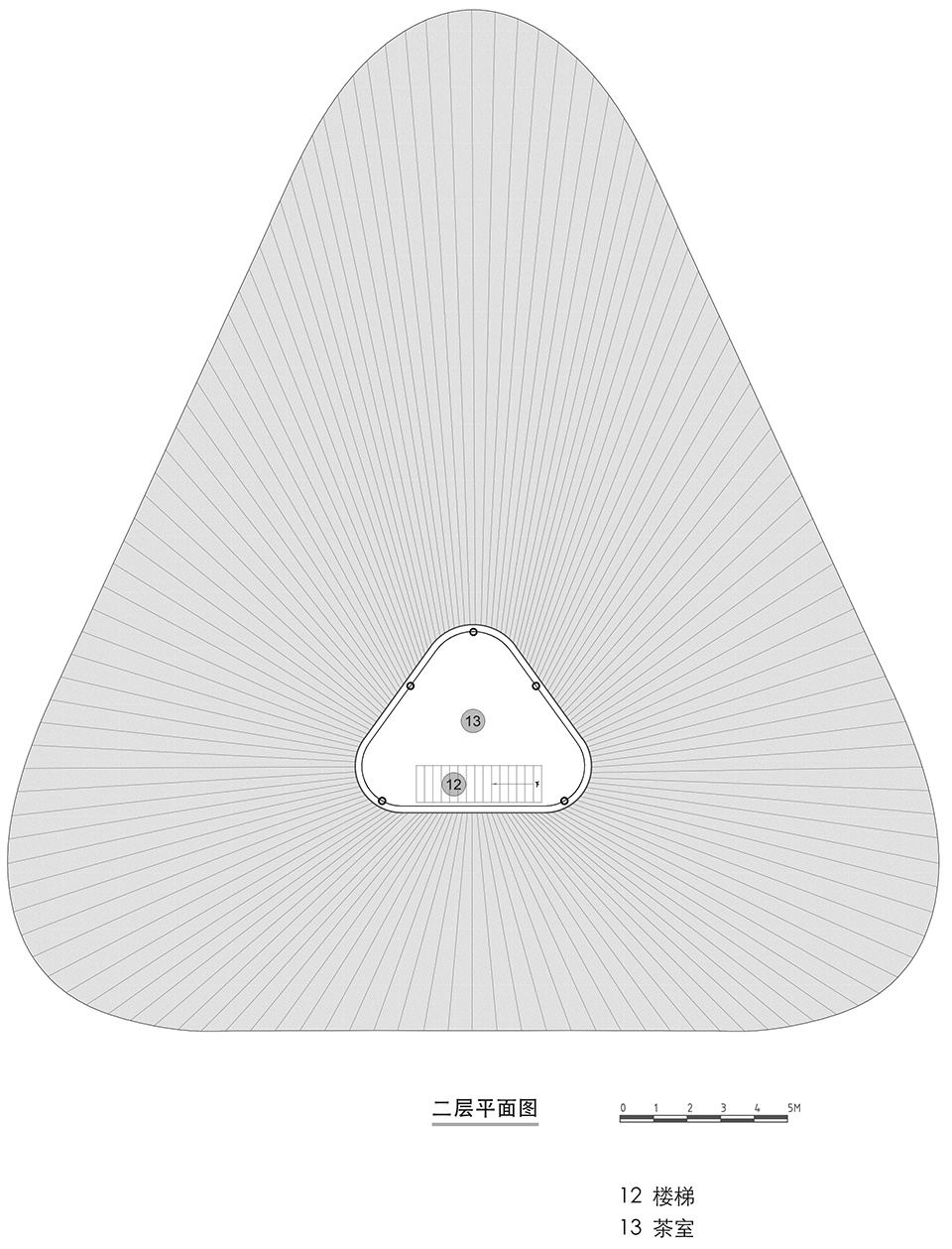 四川宜宾安石村,一个普通乡村,背靠碾盘山。村落阡陌相通,田塘错落,屋树交织,是典型的川南聚落。竹艺工坊坐落于安石村深处的一片月牙形梯田间。梯田的自然肌理与乡间道路所形成的三角形场地边界,自然而然地构成了这座建筑的轮廓。结合安石村乡村振兴的业态规划,竹艺工坊被设想为一座以竹编织工艺研究为主的工坊。