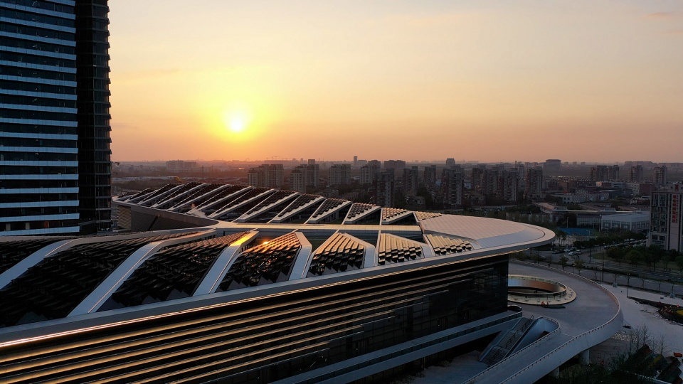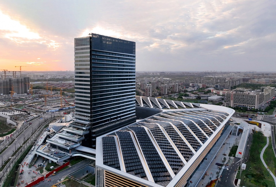 BIPV is widely used in the building. Feather shaped and row after row of photovoltaic panels on the roof bring renewable energy to the hotel. The design combines the needs of the sunlight receiving angle and the building shape, giving consideration to the air circulation of the roof equipment, and the shape is unique. The glass roof of the hotel lobby with large inclined podium on the south side of the building is designed with photovoltaic integration, which achieves the best balance between indoor permeability and sun shading, creating a comfortable indoor space.