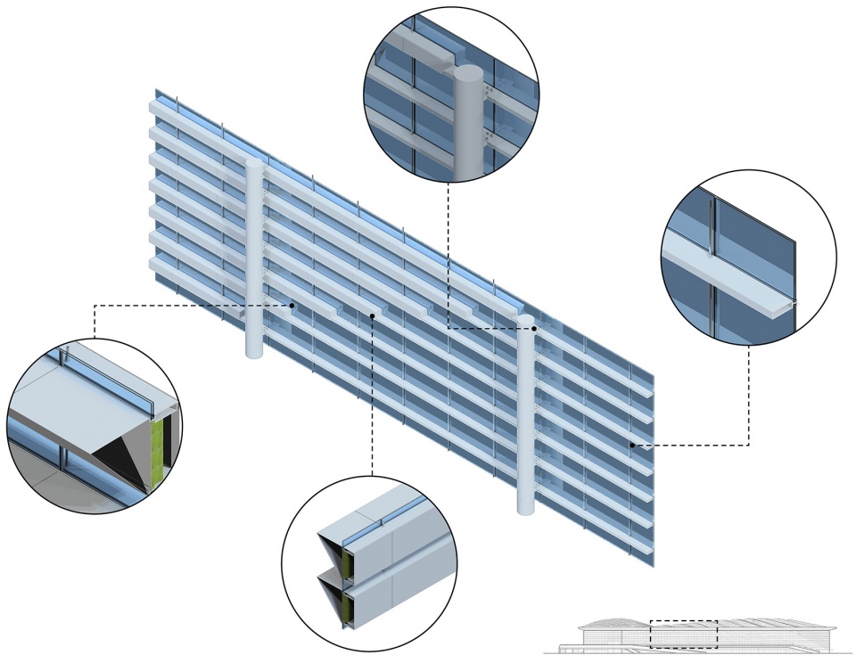 建筑的立面效果轻盈动感,立面上羽毛般片状的横向线条成为建筑重要的符号,渐变的线条营造一种动感的建筑势态,随着在视角的移动,建筑立面线条呈现流动的视觉动感,实现大体量建筑观感的统一而多变。