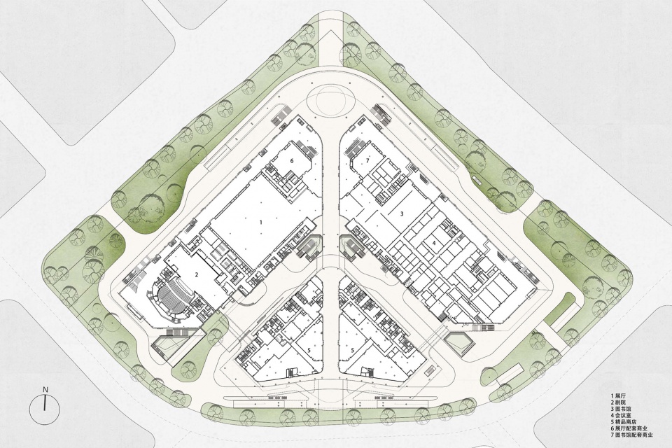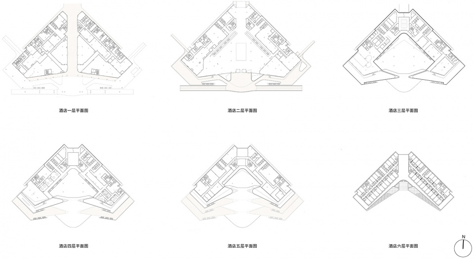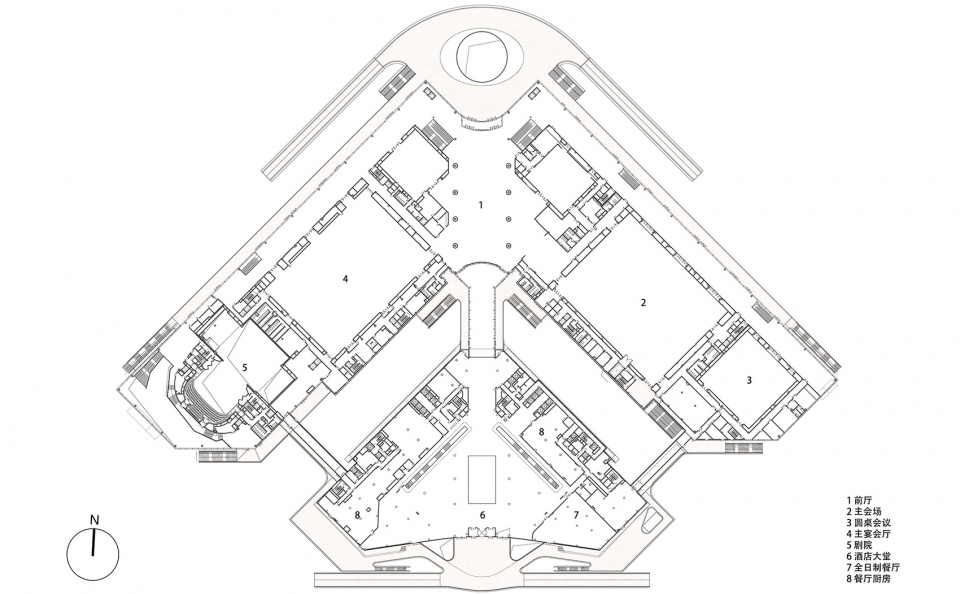 同样,二层南北中轴上布置的会议功能的公共空间和酒店的大堂,这些大人流的公共空间面向城市界面打开,建筑的开放空间和城市的广场、公园在视线及交通上链接为一个整体,建筑与城市形成连续性的组织结构,人们在城市中认识建筑,也在建筑中感受城市,建筑和人的关系联系的更加密切。