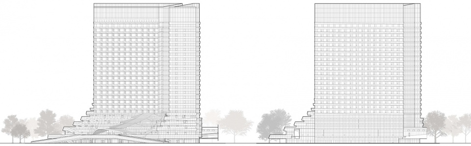 Similarly, the public space with conference function and the lobby of the hotel are arranged on the north-south axis of the second floor. These public spaces with large flow of people are open to the urban interface. The open space of the building and the square and park of the city are linked as a whole in line of sight and traffic. The building and the city form a continuous organizational structure. People experience the building in the city and feel the city in the building. The relationship between the building and people is closer.