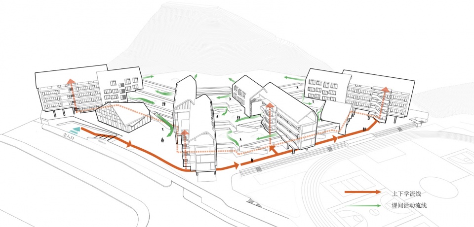 However, the existence of the mountain excited us. We believed it was an opportunity to design a unique school. The mountain is like a double-edged sword. Good design could absorb its negative effects and highlight its positive value. Therefore, our solution to the issue was all about “the mountain”. We hoped to build a mountain campus, which was promising, accessible and convenient.