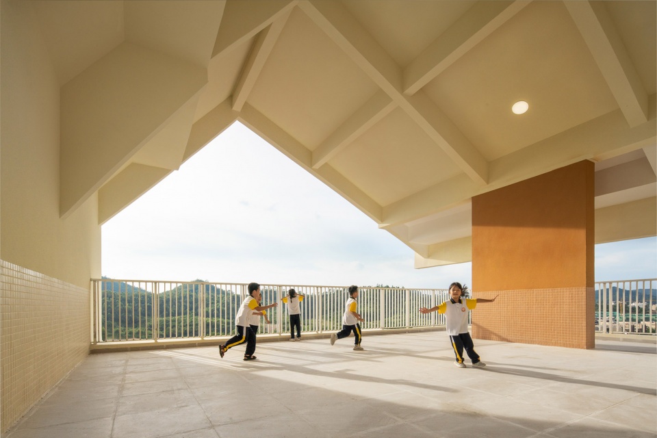 Children use the first-floor corridors at the foot of the mountain to attend school, and then use stairs after arriving at teaching buildings. In this way, our school is as convenient and safe as those built on plain since children can avoid climbing the mountain. In the spare time, children on different floors can go to the nearby stepped gardens to play and enjoy the vast space, which is not usually available on the flat campus.