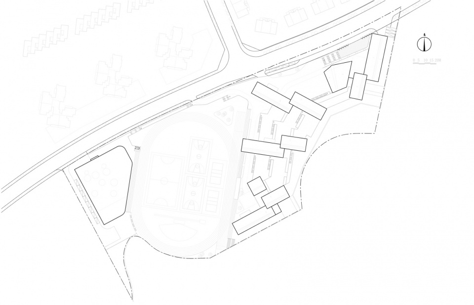 According to the natural terrain, the campus is separated into two parts. It naturally formed a green valley in the center of the site. From the road direction, campus buildings would not block too much mountain view because of the green valley.