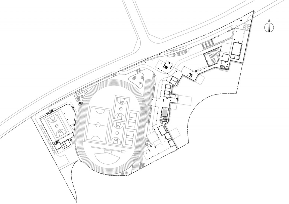 The plot is high from east to west and low in the center. In our design, the main teaching area is on the east hillside; the gymnasium, natatorium, staff dormitory and canteen are integrated into one building, which is on the west hillside; the sports field is in the central low-lying land, with proper soil-filling foundation and flood discharge trenches; a corridor on the north area of the plot is built to connect the east part and the west part of the project.