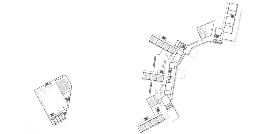 洼地中的山谷绿廊、看山的视觉走廊、山脚下的步行通廊、错动的建筑外廊、坡檐下的观景敞廊等等,一系列“廊”的空间让建筑与自然山林穿插渗透,创造了一种空间的有序性和复杂性。教学楼之间的连廊均呈折线形绕山布置,避免了一眼望穿的单调感;每层的连廊处于不同的平面位置,可以直接走到与其相邻的绿化平台。在各层行走,感受均不同,空间一直在变化中。校园不大,但感觉很大,这正是设计希望达成的空间体验。