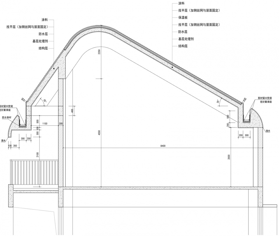 We designed a sunshade cover, integrated the air conditioning outdoor units, on the facade of the classroom side of the buildings. The solid walls rise and curl into gabled roofs, then fall to the other side of the buildings and disconnect. The half-wrapped façade naturally transitions into open corridors. The curly slope roof, which means “mountain houses”, is vaguely closer to the memory of certain Chinese symbols, while avoiding the impression of sharp gables in the West.