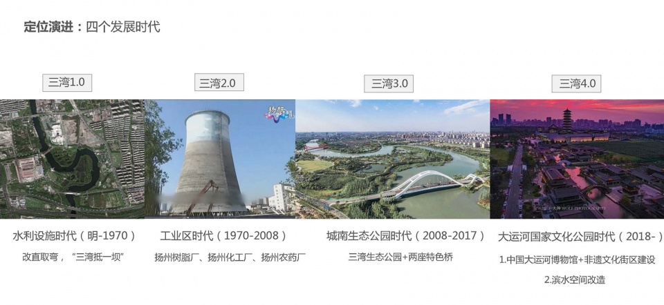 明代以前的运河三湾段(原名宝塔湾)河道平直、流速快,不利于船行,后在明代扬州知府郭光富的带领下由直取弯,进而形成三道水湾而得名“三湾”。解放后的三湾逐步发展为扬州城南的工业区,2008至2017年又逐渐由工业区蜕变为生态公园。2018年,三湾景区被重新定位为扬州南部的文旅核心,景区发展迎来新的契机,也迎来更高的要求,其中滨水空间改造工作成为景区提升的关键一步。