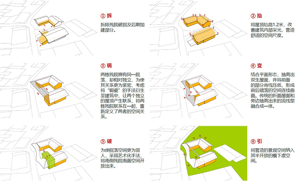 “抬”,即将屋顶抬高1.2米,改善建筑内部采光,营造舒适的空间尺寸。