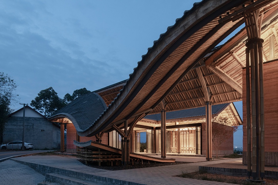 在材料的选择上,通过就地取材泥、沙、砾石组成的夯土墙,构建朴素的外墙立面,通透的玻璃瓦与青瓦的相结合,形成了现代元素与传统元素的冲突与碰撞。