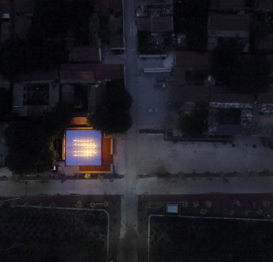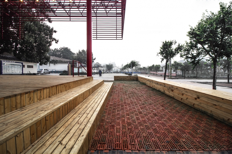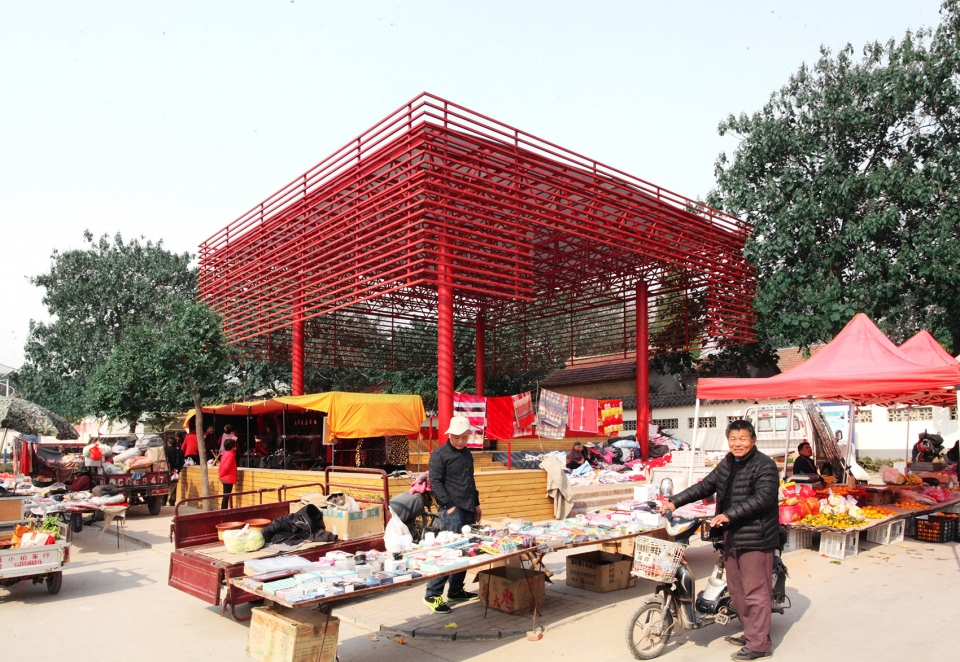 Red is a favored color in Chinese countryside. The whole roof structure is sprayed with festive red, like a red lantern, which becomes a landmark installation in the village. The Plaza where the stage located is also a place for the rural market. When markets are held, colorful stalls and bustling crowds form a fantastic and mutually contrasting picture of rural life under the huge floating red canopy. At the same time, the red canopy and its multi-functional basement space also accommodate part of the market stalls, integrating the stage with the rural fairs.