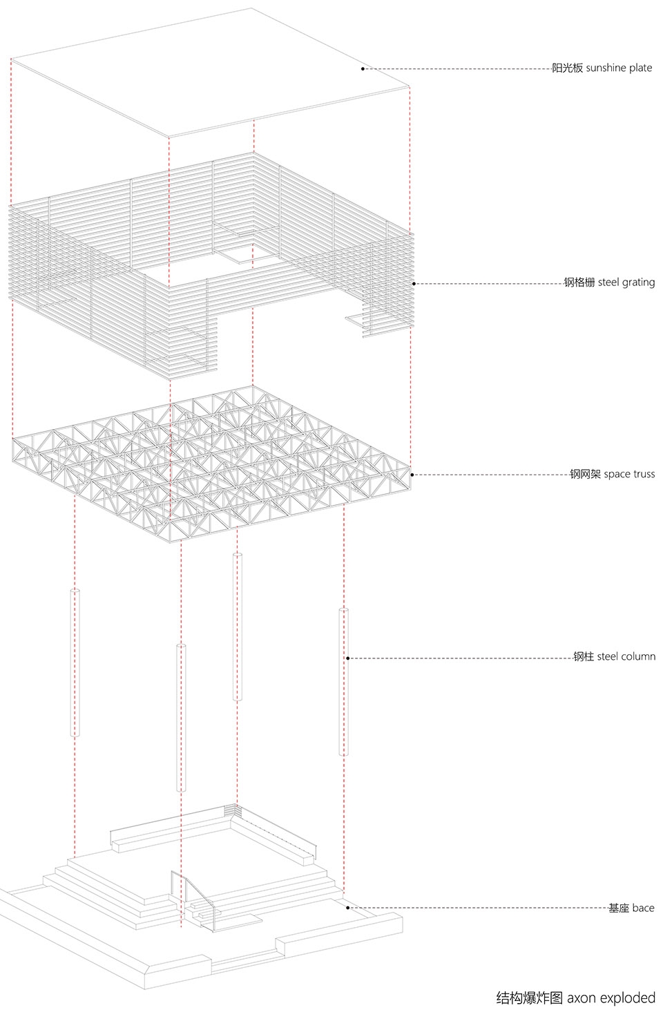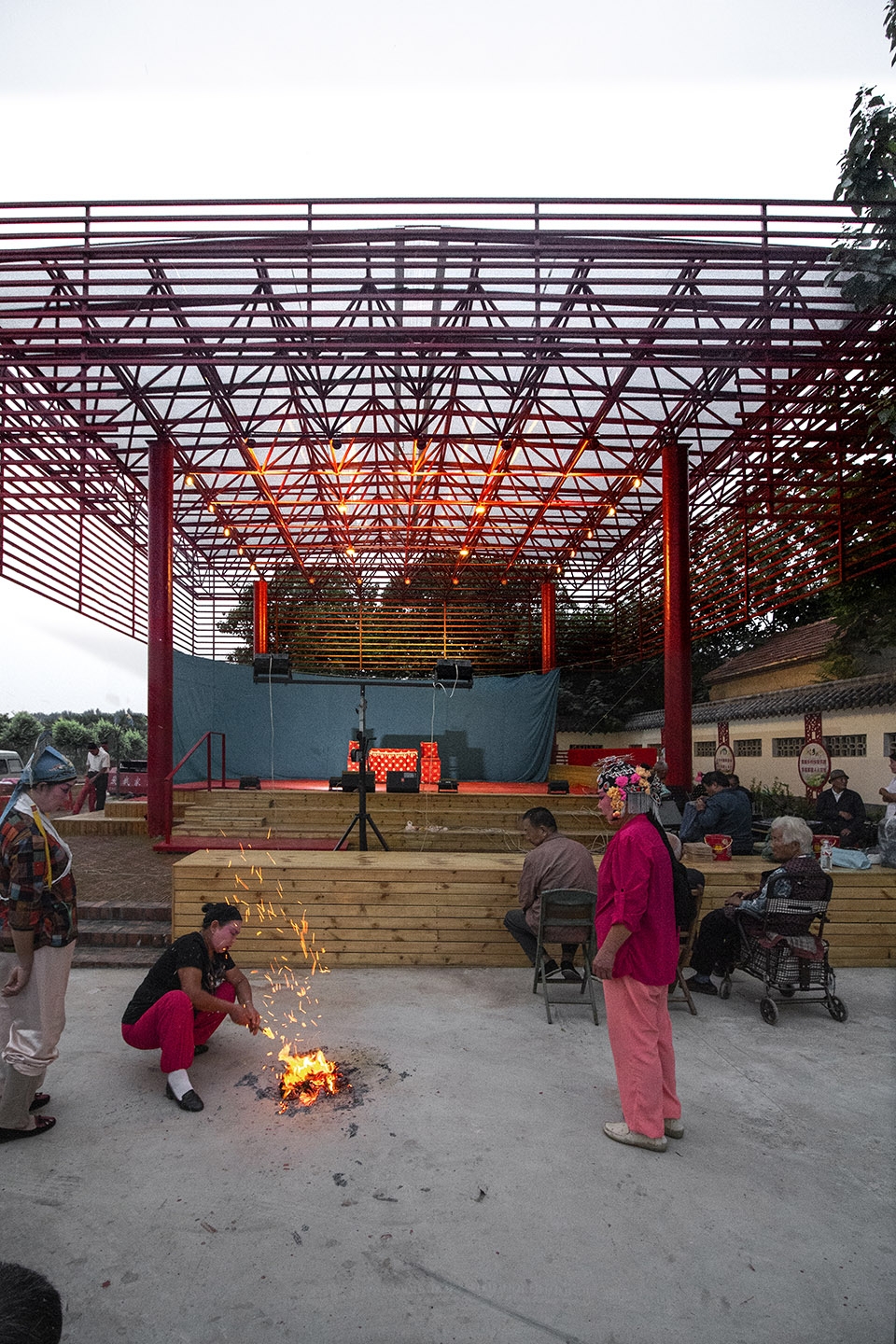 红色是中国乡村喜爱的色彩,整个屋面结构被喜庆的红色喷涂,犹如一个红灯笼,成为村子的标志性构筑。戏台所在的广场同时还是一个乡村集市的场地,每当集市的时候五颜六色的货摊和熙熙攘攘的人群与这座巨大的红伞盖形成一幅奇幻而又互相映衬的乡村生活景象,同时伞盖和下放多功能的基座空间还可以容纳一部分集市摊位,使戏台与乡村集市融为一体。