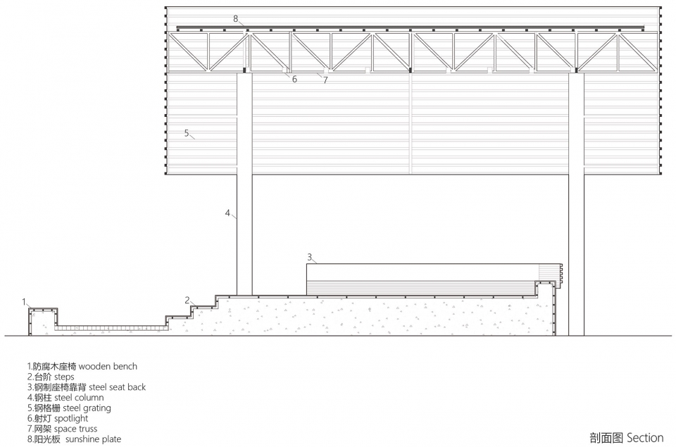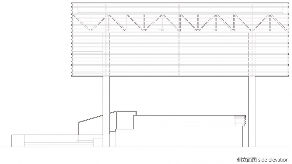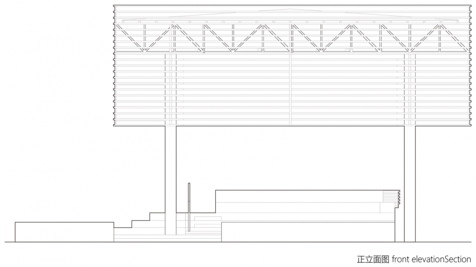 The site is located at one end of the village square, with building walls on both sides of the northwest, whereas square and roads on the southeast. Due to the obstruction of the existing buildings, the idea that the stage should be open on all sides became difficult to realize. Therefore, the two sides facing the walls are lifted upward and then turned into seats, while the other two sides extend outward, forming a small audience area. The whole floor plane of the stage and the roof form a set of two malposed squares, one large and one small, forming a special staggered spatial relationship.