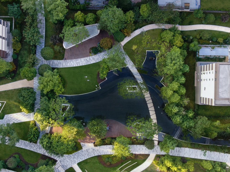 场地利用地形高差形成山谷溪水奔流之势,山令人古,水令人远,石令人静,手法重“置”、轻“叠”,注重跌瀑与石、水、植物、建筑的体量和组合关系,以及对园林工艺的悉心打磨。其跌瀑也寓意人生哲理,使人们在环境中感受到积极澎湃的精神动力。