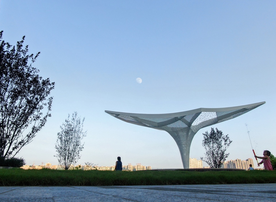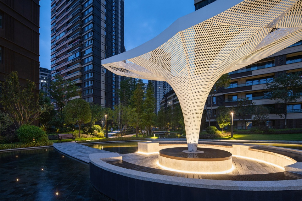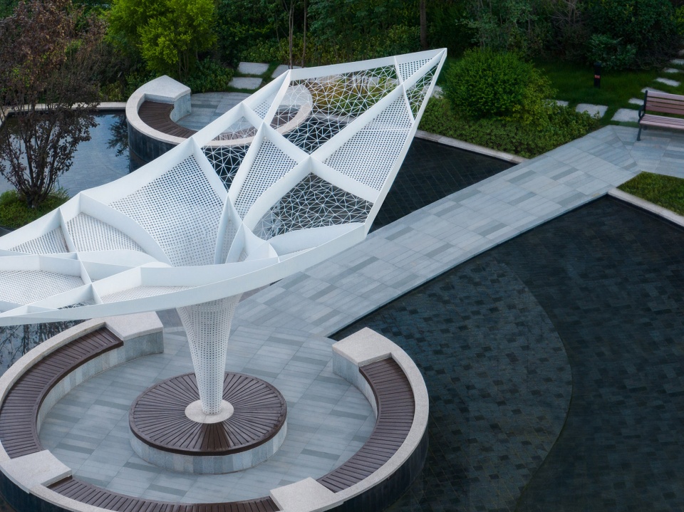 As the spiritual architecture of the project, the framework of plenilune is integrated around the theme landscape. The irregular geometric form is like an artistic sculpture with simple personality when looking from afar, and the pattern is arranged at random when looking close up, creating a relaxed and light texture. In the design stage, the process and materials are basically determined. In the construction process, the precision and details of the process are constantly discussed.