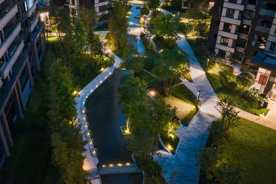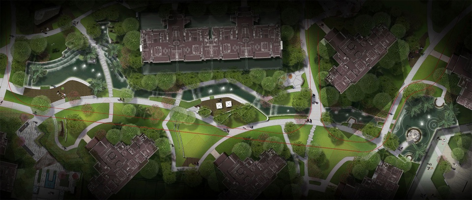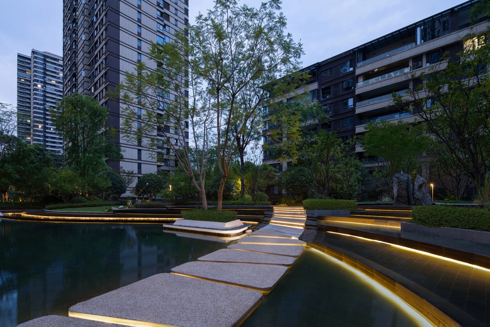 两江四岸嘉陵江畔,天阅嘉陵面江。但场地临江面较窄,江景资源有限;设计有意识地将一条溪流引入场地内部,用内部造景的形式来实现扩展场地对江景的深度述求,犹如一种“临望嘉陵江,如在江上游”的概念。