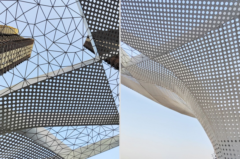 望月构架作为项目的精神建筑,围绕主题景观构筑一体化设计,不规则的几何形态,远望形如一处艺术雕塑个性简约,近看花纹错落布置,打造自在轻盈的质感。方案设计阶段,基本确定工艺与材料,施工过程中,不断探讨工艺的精准度与细节。