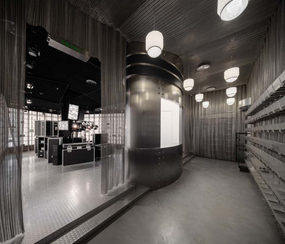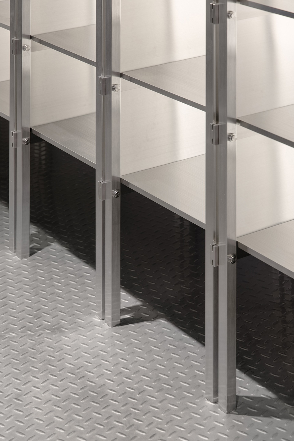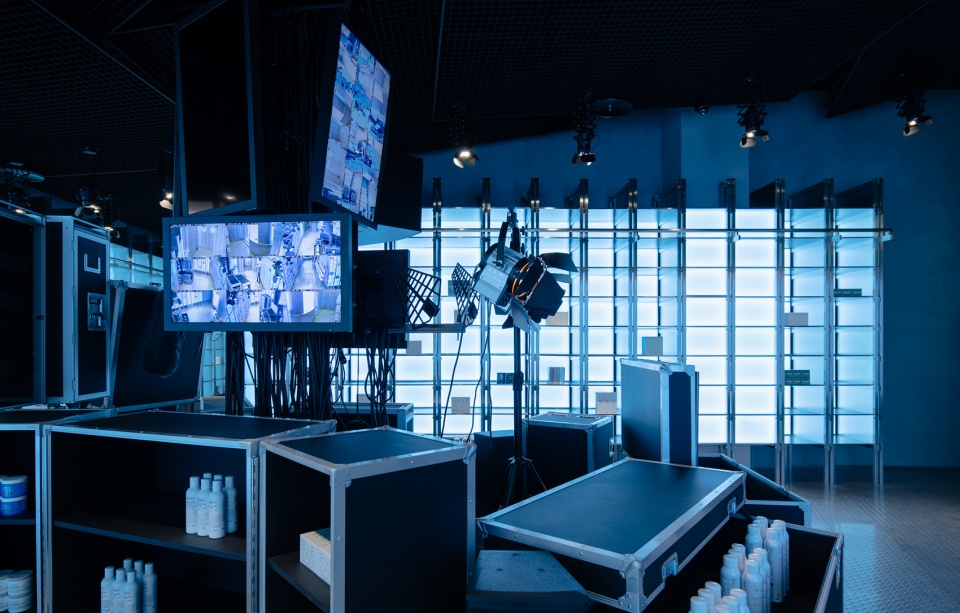 穿过金属帘,来到“后台”区域,是主要的零售空间。中心的设备、照明、监控镜头和电视屏幕被定制的架子围绕排布,灵感来自电影制景中舞台布景后场的木制品。让唤起一种亲密的、如同私人定制的“幕后”体验。
