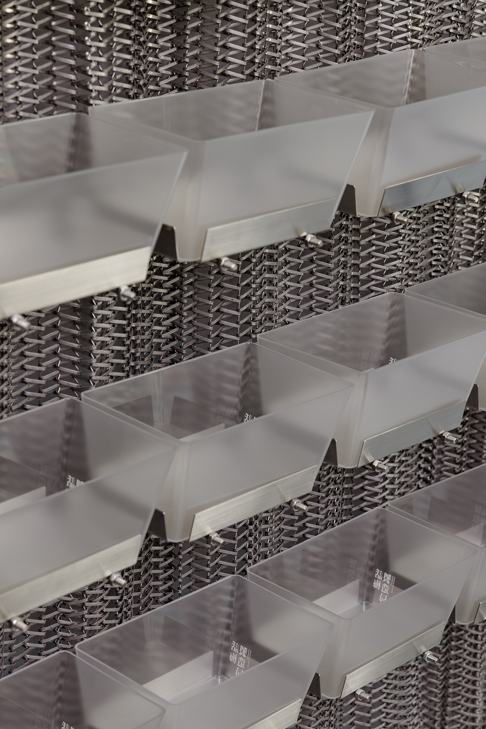 第一次闯入体验者眼帘的是店铺的外立面。大胆且内敛。它的简洁和与周围环境的鲜明对比引发着人们的好奇。密铺的铝板建构,构成一个献给話梅的“大银幕”。 穿过剧场般的大门,接着被引进了门厅——一个被密集金属窗帘包裹的空间以及中央的椭圆形服务台,让人不由自主地联想到传统剧场的门厅,所有激动人心的电影体验都从这里开始。