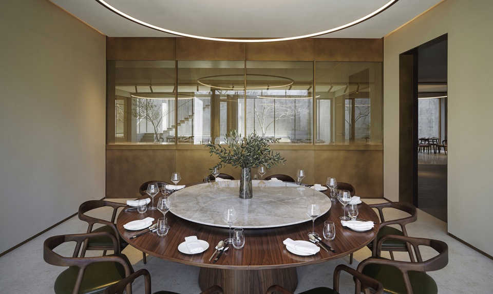 As it happens for the exterior architecture, AIM brings the same design language to the interior. Recalling the vivid colors from the traditional imperial architecture, the material palette in the Red House is rich and bold, and the textures are bright and vibrant. Red textured stucco, green marble, glazed ceramic tiles, brushed brass, and red walnut resemble the great ancient times of imperial China. The shapes are bold, rich, and curvy to recall the vibrant shapes and sinuous forms of the Forbidden City.