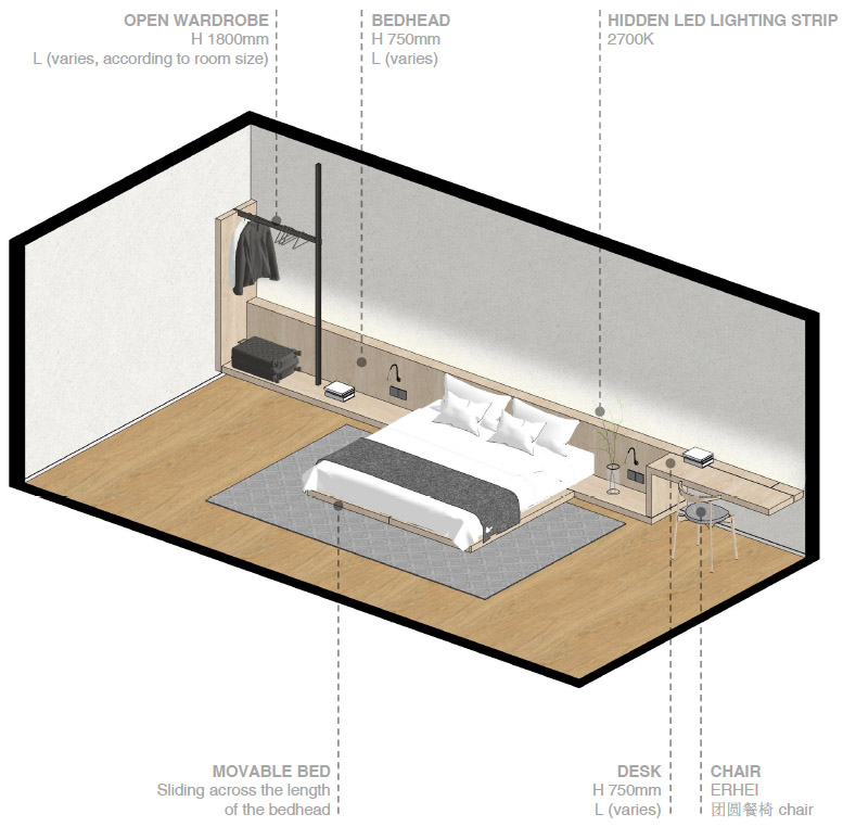 我们希望在室内延续其建筑的精髓并形成完整的体验,并延伸个人且去中心化的愿景。建筑师的愿景由内而外发散出来,带来丰富而趣味的建筑陈设、书籍、手绘及收藏。每栋建筑室内都将带给客人独特的叙事体验,还原其精神,进入建筑师的梦想世界。