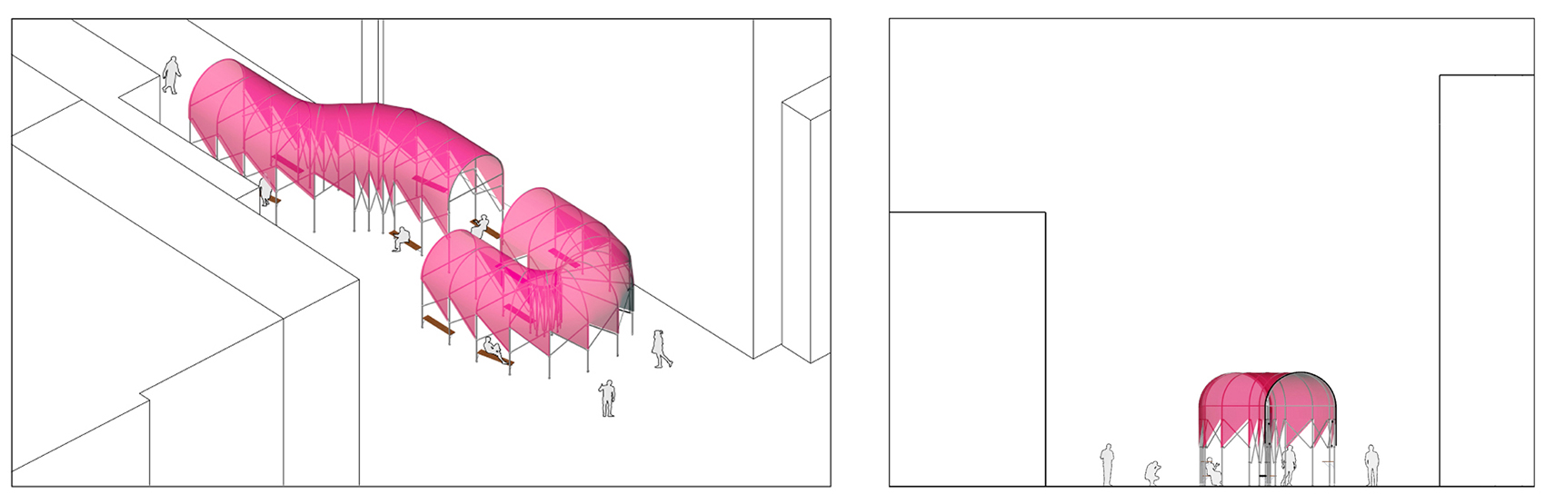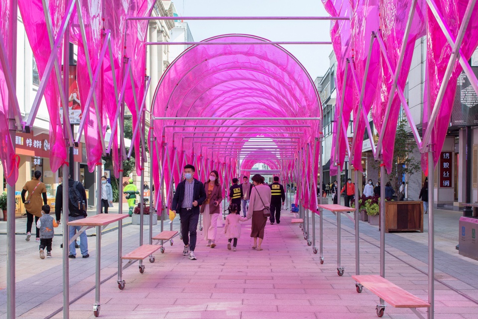 The Accordion Arcade is an evolution of the People’s Canopy, an earlier design by People’s Architecture Office. It is architecture for events and architecture as event. They are retractable arcades that can be wheeled around a city and expanded over the length of entire streets, linking disconnected public space, and creating space for shelter and events. The arched canopies allude to the curved walkways of Suzhou’s famous classical gardens, which through their small and intricate space design have a great impact on the garden experience. At the same time, the Arcade celebrates the importance of the arcade in the history of urban street life. The Accordion Arcade is divided into four sections, together forming Suzhou Design Week’s acronym SUDW when so configured and viewed from above. Thus, activating the streetscape of Guanqian Street while also highlighting this important cultural event for the city.
