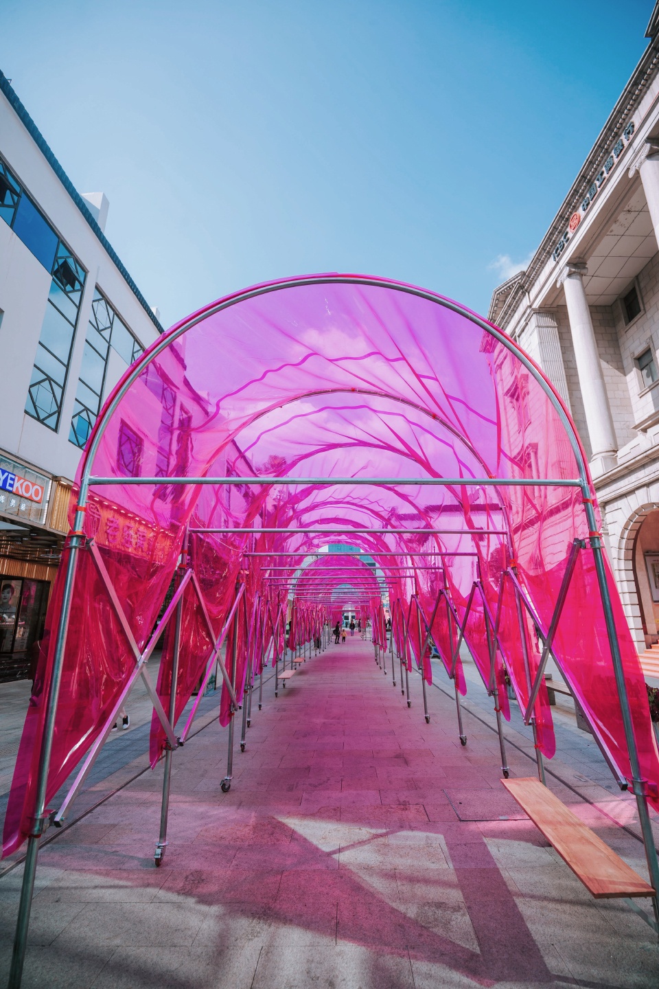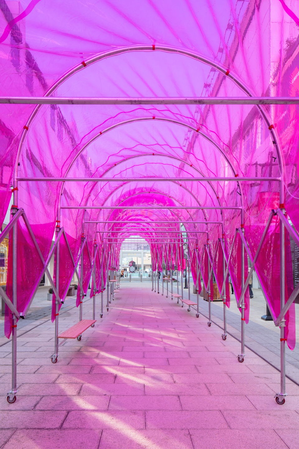 三色顶系列是为了激活未充分利用的城市公共空间而打造的一系列展览装置。该设计最初为苏州国际设计周打造,以响应历史悠久的观前商业街的当地城市条件。三个名为众行拱、蓝天泡和绿洲廊的展览装置,都是为了解决缺乏庇护所、以及缺乏座位和休息空间等特定场地的问题而设计。同时这些装置被设计为一种灵活性的解决方案,众行拱之后也被移至深圳蛇口社区设计节展出。